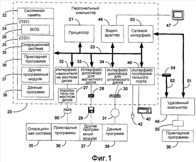 Программные модули хранятся на жестком диске 60, магнитном диске 29, оптическом диске 31, ПЗУ 24 или ОЗУ 25, включая операционную систему 35, одну или более прикладных программ 36, другие программные модули 37 и данные 38 программ. Пользователь вводит команды и информацию в устройство 20 через устройства ввода, такие как клавиатура 40 и указательное устройство 42. Другие устройства ввода (не показаны) могут включать в себя микрофон, джойстик, игровую малую клавиатуру, спутниковую антенну, сканер или тому подобные. Эти и другие устройства ввода зачастую подсоединены к процессору 21 через интерфейс 46 последовательного порта, который соединен с системной шиной, но могут быть подсоединены и с помощью других интерфейсов, таких как параллельный порт, игровой порт или универсальная последовательная шина (USB, УПШ). Монитор 47 или другой тип устройства отображения также соединен с системной шиной 23 через интерфейс, такой как видеоадаптер 48. Кроме монитора вычислительное устройство обычно включает в себя другие периферийные устройства вывода (не изображены), такие как громкоговорители и принтеры.