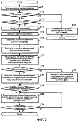 Если на операции S1 диск помещен в проигрыватель, показанный на фиг.1, блок управления 16 отыскивает в каталоге “DVD_ENAV” файл “StartUp.xml” или “EnDVD.inf”. Если соответствующий файл найден, на операции S10 вставленный диск различают как I-DVD. В противном случае, на вышеупомянутой операции S10 вставленный диск различают как обычный DVD.