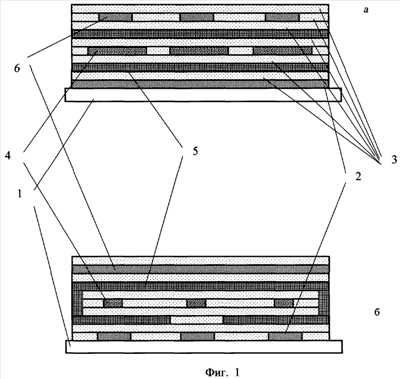 Пример 1. В наиболее предпочтительном варианте реализации устройство энергонезависимой памяти может быть изготовлено с использованием известных технологий оптической литографии, электронной литографии, наноимпринтлитографии. При этом для придания необходимых свойств исходным напыленным тонкопленочным материалам могут быть использованы потоки ускоренных частиц. Устройство может содержать подложку или основание 1, изготовленную из любого подходящего для этой цели материала, обладающего необходимыми прочностными и диэлектрическими свойствами. На основании 1 известными, указанными выше способами, создается первый набор параллельных между собой токопроводящих шин 2, изготовленных из таких материалов, как алюминий, медь, молибден и т.д., промежутки между которыми заполнены изолирующим материалом 3, в качестве которого может быть использованы оксид кремния, оксид алюминия, оксид молибдена и др. Поверх первого набора шин 2 наносится еще один слой изолирующего материала 3. Внутри предлагаемой структуры устройства энергонезависимой памяти расположены дискретные анизотропные однодоменные магнитные элементы 4. Магнитные элементы 4 охвачены токопроводящей оболочкой 5 в виде незамкнутой призматической поверхности, которая электрически соединена со средством регистрации (на чертеже не показано) и выполнена из таких материалов, как алюминий, медь и др. Над токопроводящей оболочкой 5 размещен слой диэлектрика 3 и второй набор токопроводящих шин 6, выполненных из того же материала, что и набор шин 2, и пересекающихся с первым набором шин 2 вблизи магнитных элементов 4. Второй набор шин 6 может быть накрыт сверху слоем изолирующего материала (диэлектрика) 3.
