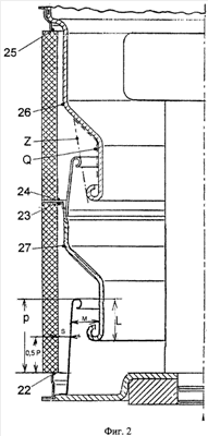 Было показано («Электротехника», 03/01, с.10) [3], что при превышении в местах крепления экранов к изоляционному корпусу камеры, например, места 22-25, фиг.2, напряженности электрического поля сверх 2,7 кВ/мм, или напряженности поля на экранах в местах на выходе из кольцевых щелей, например, места 26, 27, более 9 кВ/мм, возникает существенная вероятность инициации перекрытия. Перекрытие наступает по внутренней поверхности изоляционного корпуса между смежными экранами. Это перекрытие может привести к пробою всей камеры. Оно также приводит к металлизации корпуса и необратимому снижению внутренней изоляции камеры. Разумеется, что исключить возможность перекрытия возможно лишь путем ограничения напряженности электрического поля указанными выше значениями. Моделированием камеры на 60 кВ установлено, что при равномерном делении напряжения между экранами и при относительной глубине щели, т.е. при отношении ее глубины Р к ширине S более 4 и менее 15, т.е. при условии 4 P/S 15 ограничения напряженностей указанными значениями выполняется. Напротив, при относительной глубине P/S меньше 4 происходит инициация пробоя из точек 22-25, фиг.2. При P/S>15 пробои инициируются из точек 26, 27.