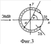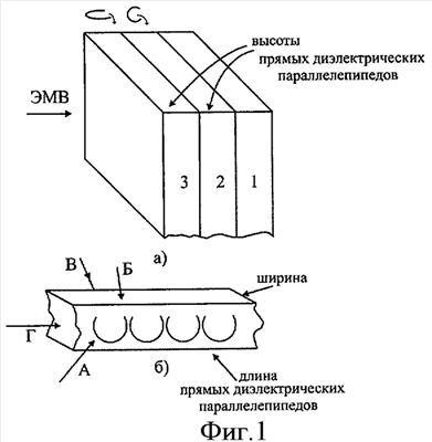 На фиг.1 показано конформное покрытие объектов, малоотражающее электромагнитные волны, для снижения радиолокационной видимости объектов и увеличения его широкополосности: структура малоотражающего покрытия (а) и прямой диэлектрический параллелепипед с решеткой в виде одинаково ориентированных разомкнутых плоских колец на одной из его поверхностей для создания 2 и 3 слоев поглощающего покрытия со взаимно ортогональными трехмерными решетками (б); 1 – поглотитель; А, Б, В, Г – обозначение граней прямого параллелепипеда; 2 – слой, составленный из вертикально склеенных диэлектрических параллелепипедов; 3 – слой, составленный из горизонтально склеенных диэлектрических параллелепипедов (б). На фиг.2 показана рассчитанная нами амплитудная диаграмма направленности в азимутальной плоскости дифрагированного поля плоской ЭМВ Н-поляризации (вектор перпендикулярен плоскости разомкнутого кольца). На фиг.3 показано металлическое разомкнутое кольцо, расположенное в азимутальной плоскости в воздухе, сплошной линией показана геометрия плоского кольца, стрелкой указано направление падения плоской ЭМВ.