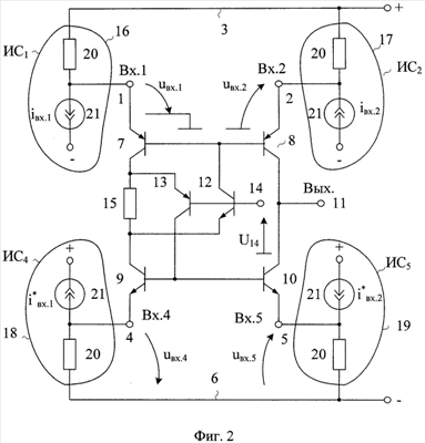Схема фиг.7 соответствует п.1 формулы изобретения для случая, когда входные преобразователи ток-напряжение реализованы на основе двухполюсников 20.1-20.5. В частном случае к коллекторам транзисторов 8 и 10 могут подключаться выходные транзисторы 25-26.
