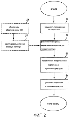 Со ссылкой на фиг.1 и фиг.2, в некоторой точке во времени, передатчик Тх принимает поток данных или сигнал для передачи к приемнику Rx. Этот поток данных разделяют или разбивают S1 на множество подпотоков данных, для которых затем формируют диаграмму направленности и которые передают S2 по меньшей мере к двум узлам ретрансляции.