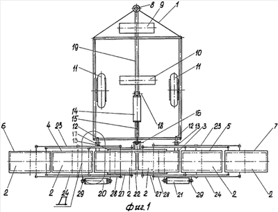 Первый неподвижный кривошип упомянутого механизма 23 (24) образован кронштейном 17 (22) центральной рамы 3. Кронштейн 17 (22) соединен с кронштейнами 25 и 26 средней рамы 4 (5) и крайней рамы 6 (7) верхним 27 и нижним 28 шатунами. Нижний шатун 28 кронштейном 29 механизма 24 связан со штоком 30 и основанием гидроцилиндра 20 (21) с кронштейном 22 центральной рамы 3.