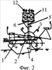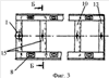 Рассмотрим устройство машины. Она состоит из посадочных секций 1 с диском 2 и расположенными на нем рассадодержателями 3, сошником 4, а на стойках 5 жестко закреплен поддон 6 [-образного профиля длиной на три рабочих места 7 с телами качения 8, расставлены двумя параллельными рядами на нижних боковых связках 9 рамы 10 поддона 6, оси вращения которых параллельны направлению движения. Тела качения 8 расставлены с равным шагом и они выступают над поверхностью боковых связок 9 на высоту не более толщины материала этих связок. На [-образный профиль поддона свободно установлен контейнер 11 для кассет с рассадой 12 высотой, достаточной для обслуживания сажальщиками, и шириной не менее чем на две ширины кассеты с возможностью продольных перемещений и фиксации в двух положениях: первое – до упора в крайний уголок 13 рамы 10 поддона 6 и второе – на расстоянии длины кассеты – А ближе к центру машины. Оба положения фиксируются стопорами 14, закрепленными вертикально снизу поверхности поддона 6 по серединам поперечных связок 15 рамы 10 поддона 6 с возможностью угловых поворотов, а форма конца каждого стержня 16 стопора 14 выполнена (см. фиг.5.) в виде круга 17 с радиально отходящими соосно выступами 18 длиной, равной радиусу круга 17, и высотой не более толщины материала поперечных связок 15 рамы 10 поддона 6. Установленный на поддон 6 контейнер для кассет 11 на своих нижних поперечных связках имеет отверстия, аналогичные форме конца стержня 16 стопора 14 и совпадающие по местоположению с их осями.