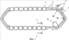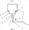 После включения приводной станции 6 замкнутый тяговый орган 7 с помощью звеньев 8 начинает перемещать кормушки 1. Кормушки 1 в зоне очистки кормушек от остатков корма, наезжая на клиновый упор 12, опрокидываются набок и очищаются от остатков корма. Положение опрокинувшихся кормушек фиксируется металлической скобой 11. При дальнейшем движении опрокинувшиеся кормушки подхватываются криволинейным элементом 13 внешней ветви направляющих 2 и ставятся в горизонтальное положение. При прохождении дозаторов-загрузчиков 5 кормушки 1 загружаются дозированными порциями различных кормов. После загрузки кормушки 1 идут под уклон, благодаря положению направляющих 2, и тем самым разгружается приводная станция 6. Во время раздачи кормов крышка 14 закрывает кормушки 1, препятствуя доступу животным к кормушкам. После раздачи кормов приводная станция отключается, и крышка 14 открывается.