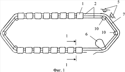 Замкнутый тяговый орган 7 в виде металлической цепи расположен под днищами кормушек 1 и соединяется с ними посредством звеньев 8 с шарнирами 9. На участках поворота направляющих 2 замкнутый тяговый орган 7 огибает поворотные ролики 10.