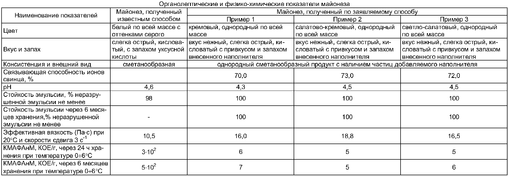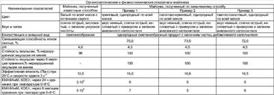 При этом в качестве наполнителя используют сухие порошки из кабачков, базилика, сельдерея в соотношении 4:2:1, а полученный состав гомогенизируют до получения готового продукта в течение 3 минут. Результаты определения органолептических и физико-химических показателей майонеза «Легкий», полученного по заявляемому способу, в сравнении с традиционным способом приведены в таблице. Полученный майонез «Легкий» имеет оригинальный вкус, аромат и благородный цвет от кремового до салатового, формирующиеся за счет сочетания 5%-ного раствора лимонной кислоты, столовой горчицы, наполнителя из сухих порошков яблок и/или кабачков, кинзы, и/или базилика, и/или сельдерея. При этом 5%-ный раствор лимонной кислоты не обладает каким-либо существенным раздражающим действием на слизистые оболочки желудочно-кишечного тракта в отличие от уксусной кислоты. Введение белкового концентрата из семян кунжута как продукта, содержащего большое количество незаменимых аминокислот, отличающегося высокой усвояемостью и атакуемостью протеолитическими ферментами организма человека, не имеющего токсических соединений, повышает пищевую и биологическую ценность заявляемого соуса. Опытным путем установлено, что при культивировании тест-микроорганизма Tetrachymena Pyriformis в течение 36 часов при температуре 28°С накопление биомассы на продукте, полученном по предложенному способу, соответствовало уровню биологической ценности 60% (в сравнении с казеином), в то время как майонезы, полученные традиционным способом, имеют биологическую ценность не выше 15%. Майонез «Легкий» не содержит яйцепродуктов, поэтому в нем практически отсутствует холестерин, являющийся причиной атеросклероза. Микробиологическая стойкость майонеза «Легкий» в течение всего срока хранения увеличивается за счет бактериостатического действия растворенного хитозана. Майонез «Легкий» является низкокалорийным, так как содержит менее 40% жира, в течение года сохраняет коллоидную стабильность, а как следствие, органолептические, физико-химические показатели готовой продукции не меняются и соответствуют первоначальным показателям.
