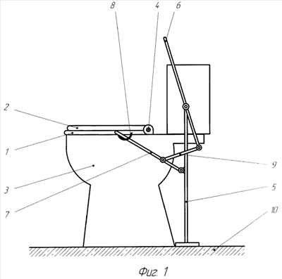 Стульчак 1 (фиг.1) с крышкой 2 расположен на унитазе 3 с возможностью перемещения относительно шарнира 4. Механизм перемещения стульчака 1 состоит из звена-стойки 5, рукояти 6, рычага 7 (ведомое звено механизма), проушины 8 и тяги 9.