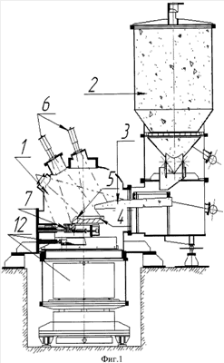 Средствами нагрева для плавления шихты в тигле 4 являются электронно-лучевые пушки с системой сканирования луча или плазмотроны. Для предотвращения намерзания металла в сливном канале тигля один из применяемых нагревателей обеспечивает его очистку и проходимость на момент слива расплава из тигля в формообразующую полость, где происходит отливка гранулы требуемого химического состава, веса и размеров.