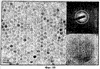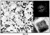 На фиг.14 представлено полученное с помощью ТЭМ примерное изображение кубовидных наночастиц железа (Fe) диаметром 20 нм, синтезированных в варианте осуществления 9, а вставки в верхнем правом и нижнем правом углах – это электроннограмма и полученное с помощью высокоразрешающего ТЭМ изображение тех же самых наночастиц Fe соответственно.