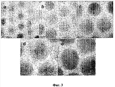 На фиг.3а, 3b, 3с, 3d, 3е представлены полученные с помощью высокоразрешающего ТЭМ примерные изображения наночастиц оксида железа разного размера диаметром (а) 5 нм, (b) 9 нм, (с) 12 нм, (d) 16 нм и (е) 22 нм, синтезированных в примерах 3, 4, 2, 5 и 6 соответственно.