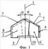 Согласно первому варианту режущей пластины (см. фиг.1-3) на тангенциальных опорных поверхностях 6 выполнены уступы, боковые стенки 10 которых расположены симметрично относительно оси симметрии 1 и под углом к ней, вершина которого расположена с противоположной стороны от поперечной режущей кромки 8.