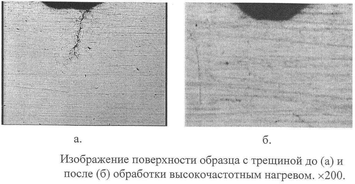При этом образец, имеющий поверхностные трещины, помещают в индуктор и производят разогрев и охлаждение в любой среде, например на воздухе, в масле или в воде в зависимости от марки стали, из которой изготовлено изделие. Данный метод обработки позволяет обрабатывать изделия различной формы и длины. Дополнительный эффект повышения ресурса работы стального изделия, по предложенному способу, достигается дополнительной термической обработкой – закалкой.