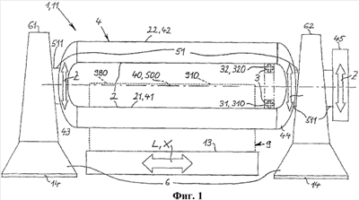 Согласно другому варианту изобретения, вместо рамы, которая объединяет несущие направляющие, устройство снабжено внутренним портальным устройством и внешним портальным устройством. Внутреннее портальное устройство держит, по крайней мере, одно внутреннее несущее направляющее, в то время как внешнее портальное устройство держит, по крайней мере, одно внешнее несущее направляющее, причем внутреннее несущее направляющее может регулироваться вращением на продольной оси вращения внутреннего портального устройства, в то время как внешнее несущее направляющее может регулироваться вращением на продольной вращательной оси внешнего портального устройства, при этом ось вращения предпочтительно расположена параллельно внутренней портальной продольной оси вращения. Предпочтительно, что внутреннее портальное устройство и внешнее портальное устройство включают две колоннообразных монтажных детали, между которыми установлено держащееся на них портальное несущее, причем колоннообразные монтажные детали каждого портального устройства смонтированы так, чтобы быть подвижными, по крайней мере, в одном первом пространственном направлении поперек продольного направления кожуха, с возможностью закрепления, и нести вращательные опоры, каждая из которых держит портальное несущее, и, по крайней мере, регулируются в одном втором пространственном направлении поперек продольного направления кожуха, насколько позволяет высота колонны монтажных деталей.