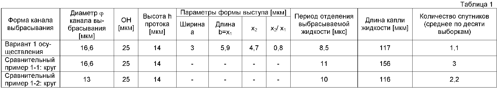 Варианты c 3-1 по 3-5 осуществления представляют собой примеры, в которых между полукруглыми участками диаметром 11 мкм, как показано на Фиг.17, вставлены выступы, размеры которых приведены в таблице, а зависимость между M, L и Н, и значениями, приведенными в таблице, является такой же, как для варианта 1 осуществления. В этих вариантах осуществления, объем выброса составляет 1,7 нг. В диапазоне 1,6 х2/х1, как показано в вариантах с 3-1 по 3-5 осуществления, было получено малое количество спутников. В сравнительном примере 3-1 применяется круглый канал выбрасывания диаметром 11 мкм, а объем выброса составляет 1,6 нг. В сравнительном примере 3-2 применяется форма, в которой между полукруглыми участками диаметром 11 мкм вставлены выступы длиной 0,7, а объем выброса составляет 1,7 нг. В данном случае, в сравнительном примере 3-2, х1 для площади Х выступов составляет 0,7 мкм, а х2 составляет 3,0 мкм, и х2/х1=4,3. Время отделения выбрасываемой жидкости укоротилась, длина капли жидкости, количество спутников – все эти параметры увеличились по сравнению с вариантами осуществления.