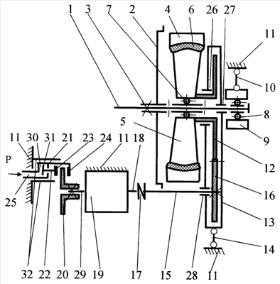 Силовой привод дискового тормоза состоит из тормозного диска 20, который жестко закреплен на втором конце вала 29 тягового двигателя 19. Суппорт 21 тормозного привода выполнен в виде скобы и установлен в телескопическом шарнире 32, жестко закрепленном на раме 11. В корпусе суппорта 21 с одной стороны установлен тормозной цилиндр 30 с поршнем 31, на штоке 22 которого закреплена тормозная накладка 23. Вторая накладка 24 установлена на противоположной стороне суппорта 21. Корпус цилиндра 30 имеет входной канал 25, через который подается рабочее давление Р.