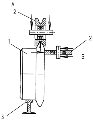 В качестве примера реализации предлагаемого способа торможения колесного транспортного средства на чертеже приводится схема фрикционного взаимодействия колеса 1 транспортного средства и тормозной колодки 2, выполненной в виде колеса. Вариант А с параллельным расположением оси колодки относительно оси колесной пары предусматривает взаимодействие коническими контурными поверхностями. Вследствие различного расположения контактных поверхностей относительно центров вращения колеса и колодки происходит проскальзывание в зоне контакта, вызываемое различием скоростей в зоне контакта, при котором возникает тормозная сила между колодкой и колесом, а также сила сцепления между колесом и рельсом 3. При этом передача сил фрикционного взаимодействия происходит в режиме качения тормозной колодки по колесу транспортного средства и колеса транспортного средства, например, по головке рельса.