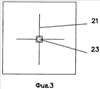 Оператор одновременно наблюдает на мониторе изображение лазерного пятна 23 канала наведения и электронной выверочной марки 21. Изображение лазерного пятна совмещают при помощи соответствующих кнопок на панели управления прицела-прибора наведения с допусковым квадратом электронной выверочной марки, тем самым, обеспечивая выверку осей канала наведения и визирного канала, как показано на фиг.3.