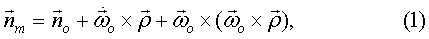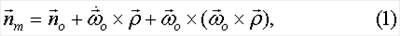 Если ИБ БИИМ разместить на ОУ в точке m с некоторым отстоянием в осях связанного с ОУ трехгранника xoyozo от его ц.м., то вектор кажущегося ускорения в точке m при допущении, что объект является абсолютно жестким и обладает вектором угловой скорости (из-за вращения вокруг продольной оси и возможного конического вращения относительно ц.м.), может быть представлен в виде (Анучин О.Н., Емельянцев Г.И. “Интегрированные системы ориентации и навигации для морских подвижных объектов / под общ. редакц. акад. РАН В.Г.Пешехонова/. – СПб.: ЦНИИ «Электроприбор», 2003. – 389 с.):