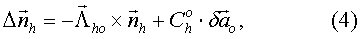 где – вектор инструментальных погрешностей акселерометров в осях объекта. Учитывая, что   =- , где  – кососимметрическая матрица, соответствующая вектору погрешностей задачи ориентации (Анучин О.Н., Емельянцев Г.И. “Интегрированные системы ориентации и навигации для морских подвижных объектов / под общ. редакц. акад. РАН В.Г.Пешехонова/. – СПб.: ЦНИИ «Электроприбор», 2003. – 389 с.), получим