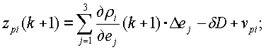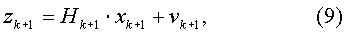 Hk+1 – матрица измерений размерности 2×23 для каждого HCi, соответствующая уравнениям (7), (8) с учетом соотношений связи между погрешностями выработки декартовых и географических координат места и погрешностями в выработке составляющих вектора линейной скорости объекта в проекциях на гринвичские и географические оси; vk+l – шумы измерений.