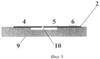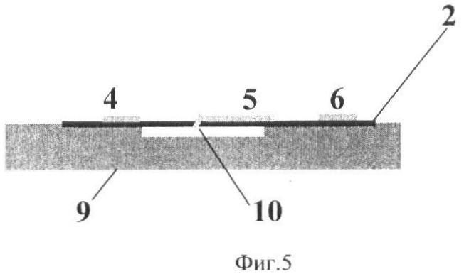На фиг.5 представлена схема трехконтактного актюатора, действующего по тому же принципу, что и представленный на фиг.3, 4. В данном варианте отсутствуют контакты, подвешенные над подложкой. Цифрами (4, 5, 6) показаны напыленные золотые контакты, один из которых шунтирует половину рабочего элемента (2). Часть рабочего элемента 4-5 подвешена над подложкой (9), другая часть (5-6) плотно прилегает к ней. Крутильные колебания возбуждаются подачей переменного напряжения 4-5, а контролируются по напряжению 5-6 (или наоборот). Применение зеркала (10) не обязательно. Данная конфигурация легко масштабируется до нанометровых размеров.