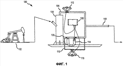На фиг.1 показана блок-схема системы 100 для измерения нефти и газа согласно варианту осуществления изобретения. Система 100 соединена с оборудованием 102 устья скважины и содержит сепаратор 104, выпускную трубу 108 для жидкости, выпускную трубу 106 для газа, водоотделитель 110, расходомеры 116, 114, 112, выпускную трубу 118 системы и компьютера 120 для нефти.