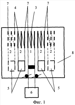 При малых индуктивности и сопротивлении каждой индивидуальной катушки индуктивности 4 колебательного контура 2 время ее релаксации мало, что позволяет использовать в работе контура высокую частоту переменных электромагнитных колебаний.