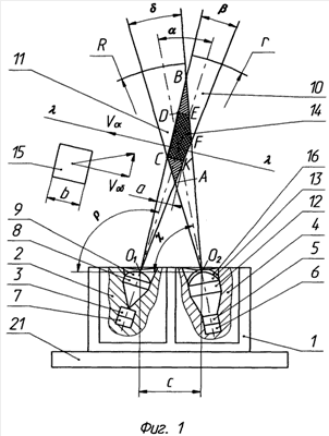 На фиг.2 в плоскости развертки зоны чувствительности 14 ее размеры и конфигурация определяются параметром «d» – профильная проекция расстояния между точками O1O2, углами “ , , “, где
