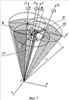 На фиг.5 показано поле обзора пространства ЛЛ со сферическим размещением зон чувствительности 14, 27, 30 отдельных БОП. При этом БОП могут располагаться как стационарно, так и осуществлять сканирование пространства путем вращения зон чувствительности 14, 27, 30 каждого БОП в направлении, перпендикулярном плоскости их развертки. При вращении зоны чувствительности одного БОП общая зона обзора образуется в виде конического объема. При этом можно обеспечить определение в сферической системе координат только двух координат – расстояния и долготы . Для определения третьей координаты – полярного угла требуется совмещение нескольких конических зон обзора. Мгновенные координаты объекта обнаружения 15 в направлении осей , также определяются местом пересечения зон чувствительности соответствующих БОП, при этом радиус-вектор r1 определяется автоматически как расстояние до объекта обнаружения 15.
