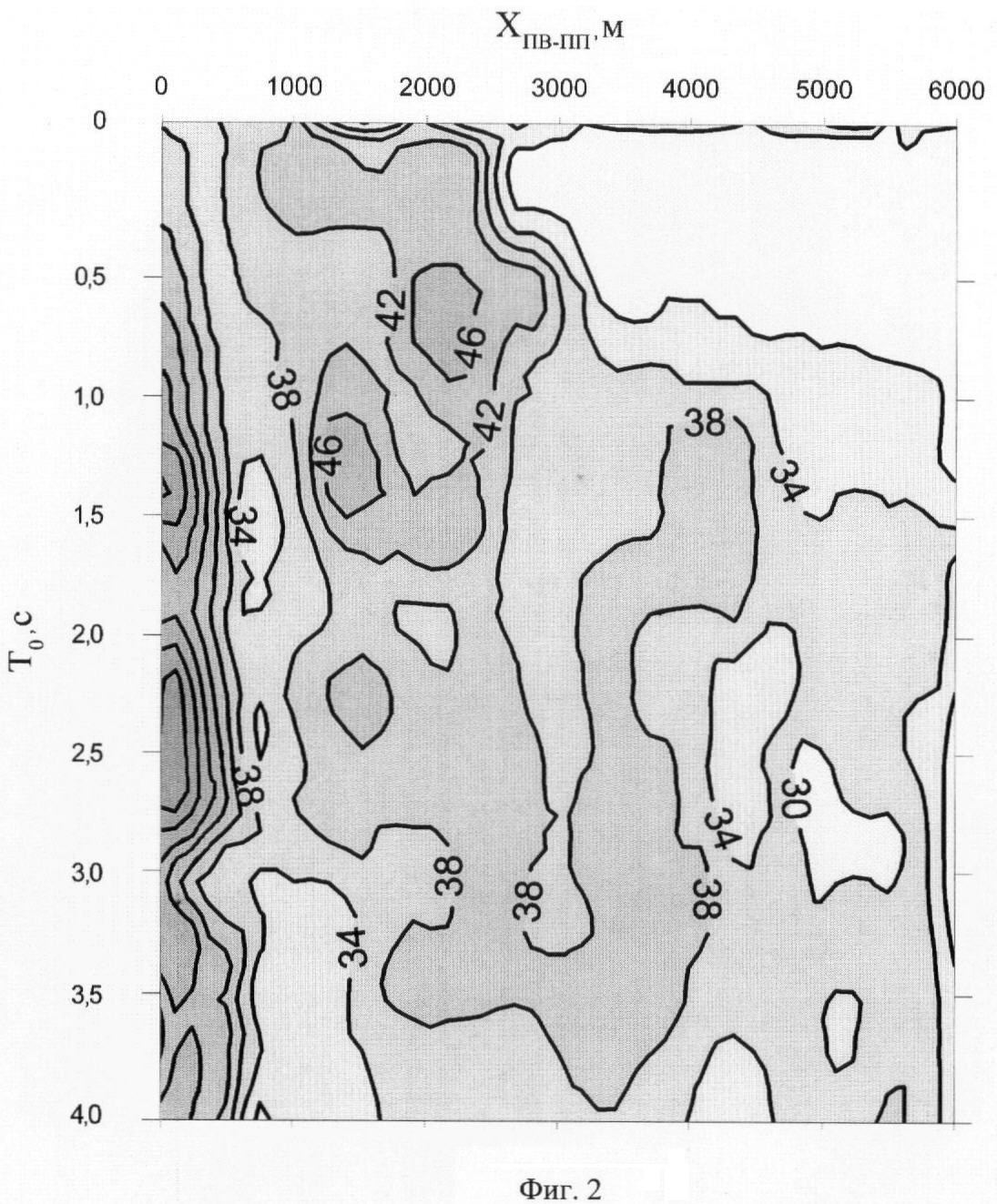 Фиг.2 демонстрирует распределение на том же пикете преобладающих частот F в той же координатной плоскости. Анализ распределения преобладающих частот вскрывает отчетливо выраженную тенденцию к уменьшению F с ростом удалений источник – приемник и величины Т0.