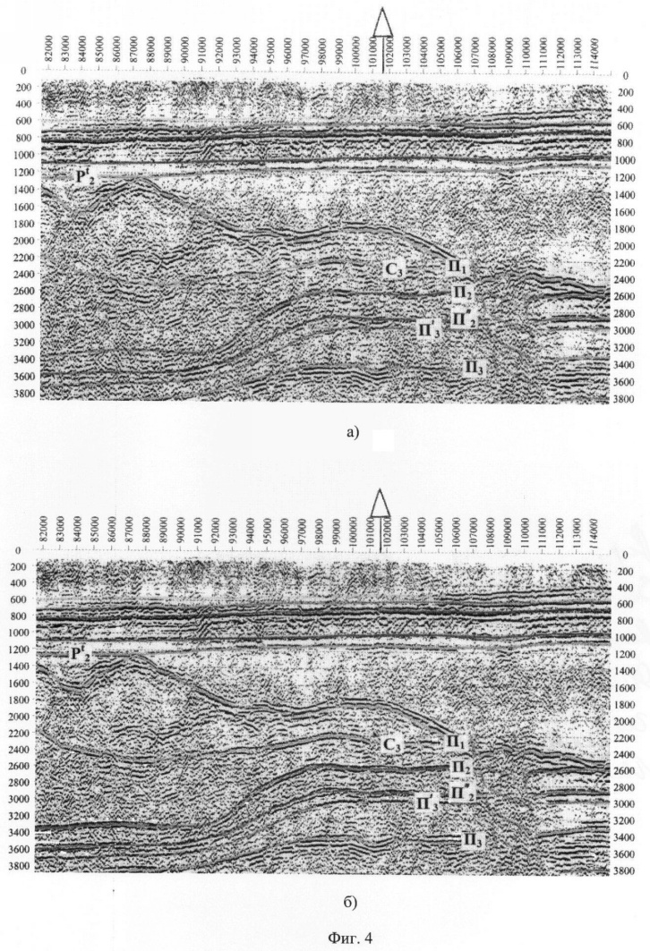 Рост качества данных МОГТ в случае применения предложенного способа по сравнению с прототипом подтверждаются данными анализа временных разрезов анализируемого фрагмента профиля /см. фиг.4/. При применении разработанного способа улучшилась по сравнению с прототипом динамическая выразительность и прослеживаемость всех целевых отражающих горизонтов /см. фиг.4, Т0=1.0-3.8 с/. Выигрыш в качестве временных разрезов подтверждается также сопоставлением количественных оценок отношения сигнал/помеха. Эти оценки сведены в таблицу. Как следует из приведенной таблицы, применение заявленного способа привело к увеличению отношения сигнал/помеха на 5-31% по сравнению с прототипом.