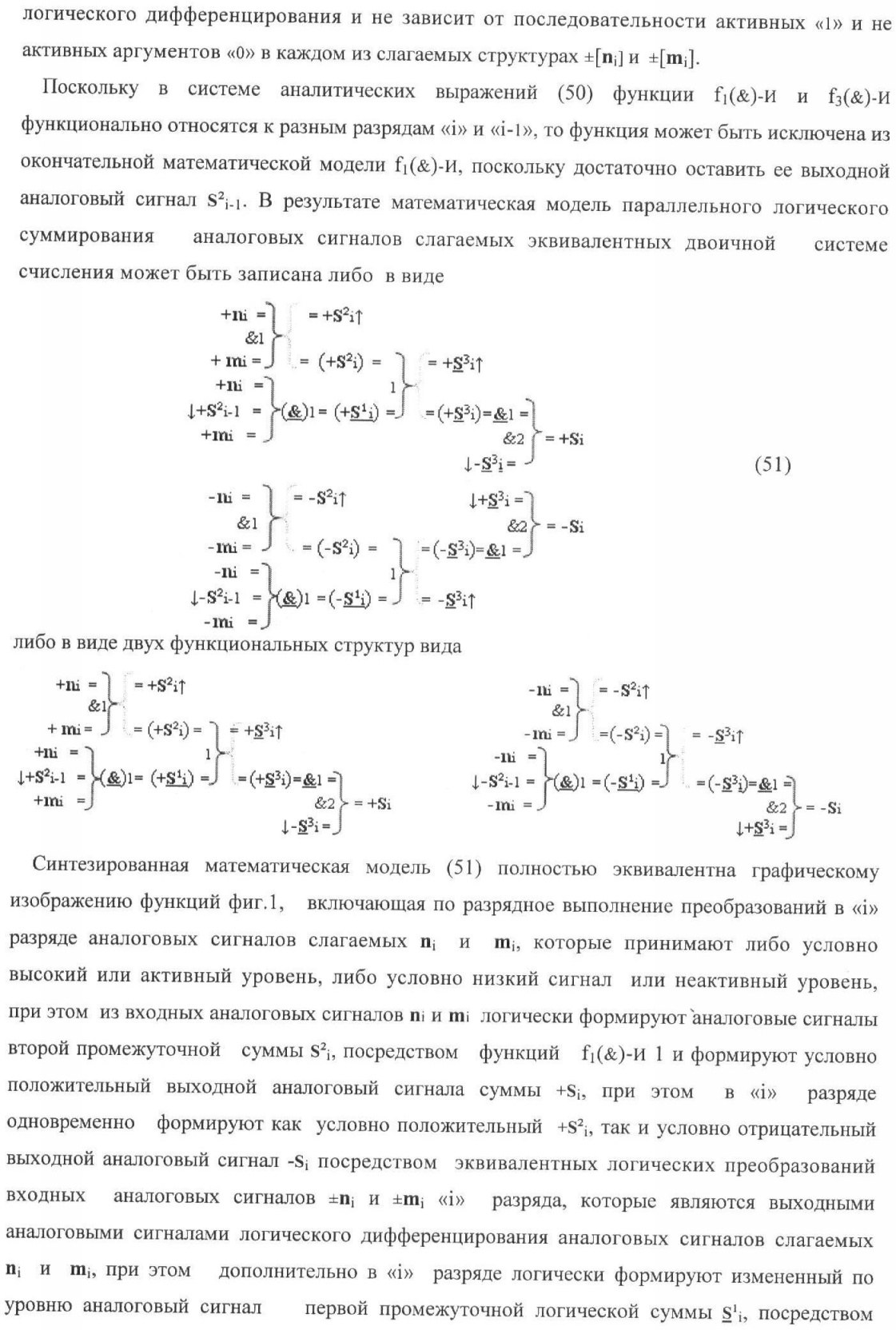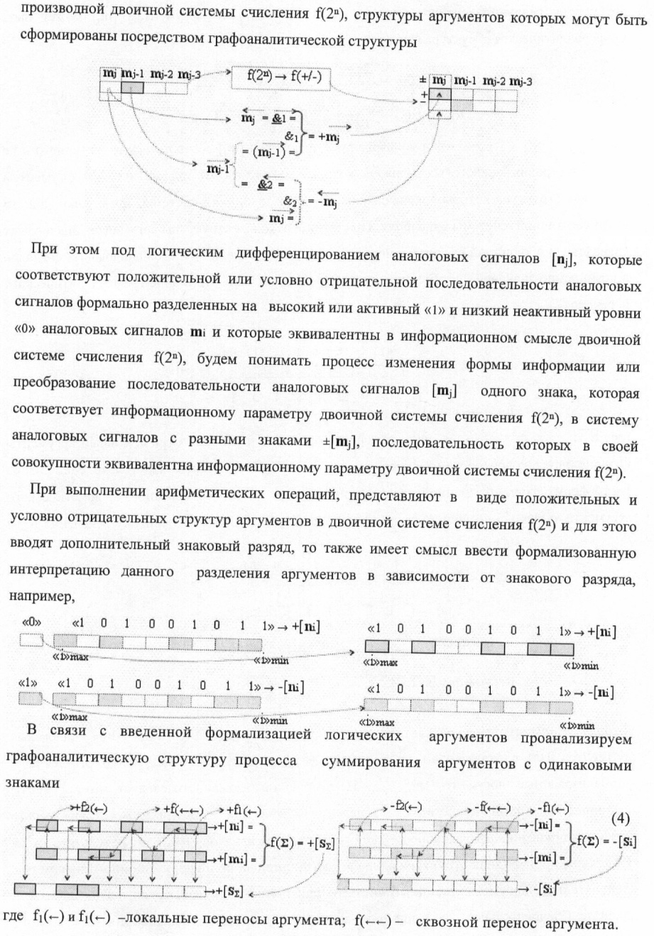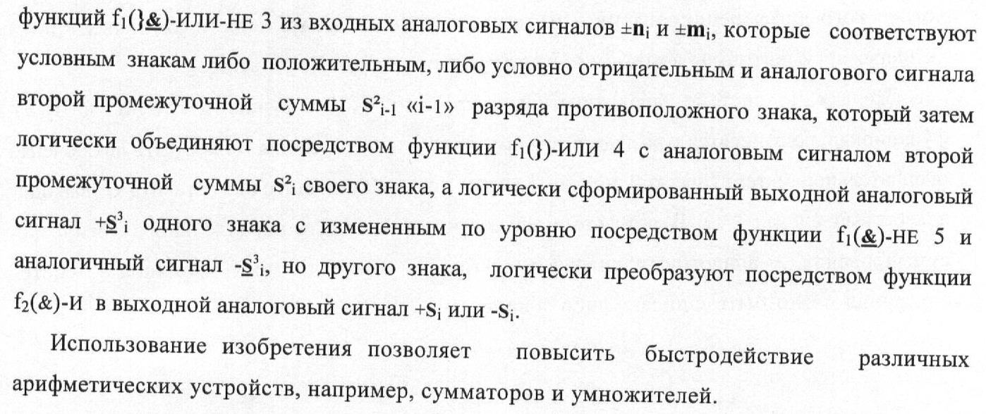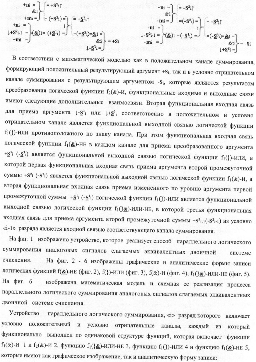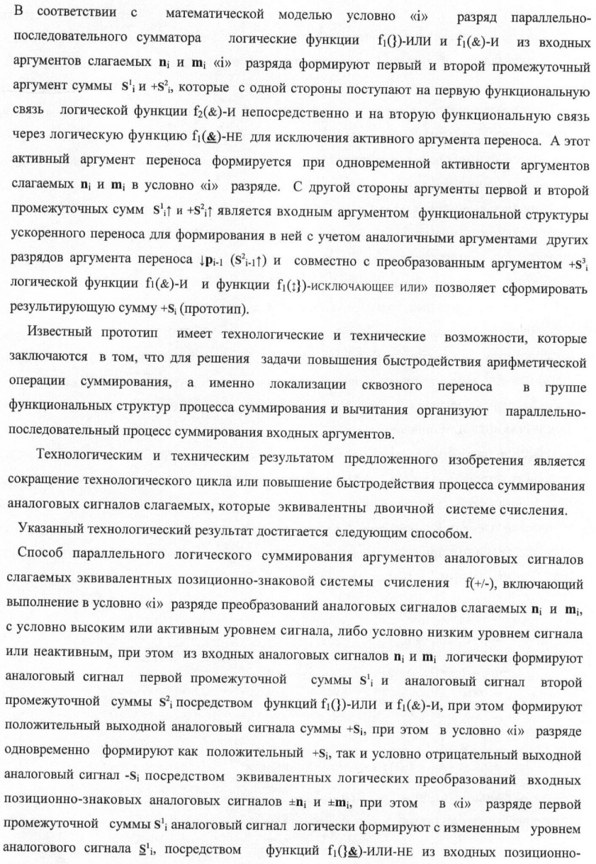 1. Способ параллельного логического суммирования аналоговых сигналов слагаемых, эквивалентных позиционно-знаковой системе счисления f(+/-), включающий выполнение в условно «i» разряде преобразований аналоговых сигналов слагаемых ni и mi, с условно высоким или активным уровнем сигнала либо условно низким уровнем сигнала или неактивным, при этом из входных аналоговых сигналов ni и mi логически формируют аналоговый сигнал первой промежуточной суммы S1 i и аналоговый сигнал второй промежуточной суммы S2 i посредством функций f1(})-ИЛИ и f1(&)-И, при этом формируют положительный выходной аналоговый сигнал суммы +Si, отличающийся тем, что в условно «i» разряде одновременно формируют как положительный +Si, так и условно отрицательный выходной аналоговый сигнал -Si посредством эквивалентных логических преобразований входных позиционно-знаковых аналоговых сигналов ±ni и ±mi, при этом в «i» разряде первой промежуточной суммы S1 i аналоговый сигнал логически формируют с измененным уровнем аналогового сигнала S1 i, посредством функций f1(}&)-ИЛИ-НЕ из входных позиционно-знаковых аналоговых сигналов ±ni и ±mi и аналогового сигнала второй промежуточной суммы S2 i-1 «i-1» разряда, который затем логически объединяют посредством функции f1(})-ИЛИ с аналоговым сигналом второй промежуточной суммы S2 i «i» разряда, а логически сформированный выходной аналоговый сигнал +S3 i с измененным по уровню посредством функции f1(&)-HE и аналогичный сигнал –S3 i, но другого знака, логически преобразуют посредством функции f2(&)-И в выходной аналоговый сигнал +Si или -Si, при этом логико-динамический процесс реализуют в соответствии с математической моделью