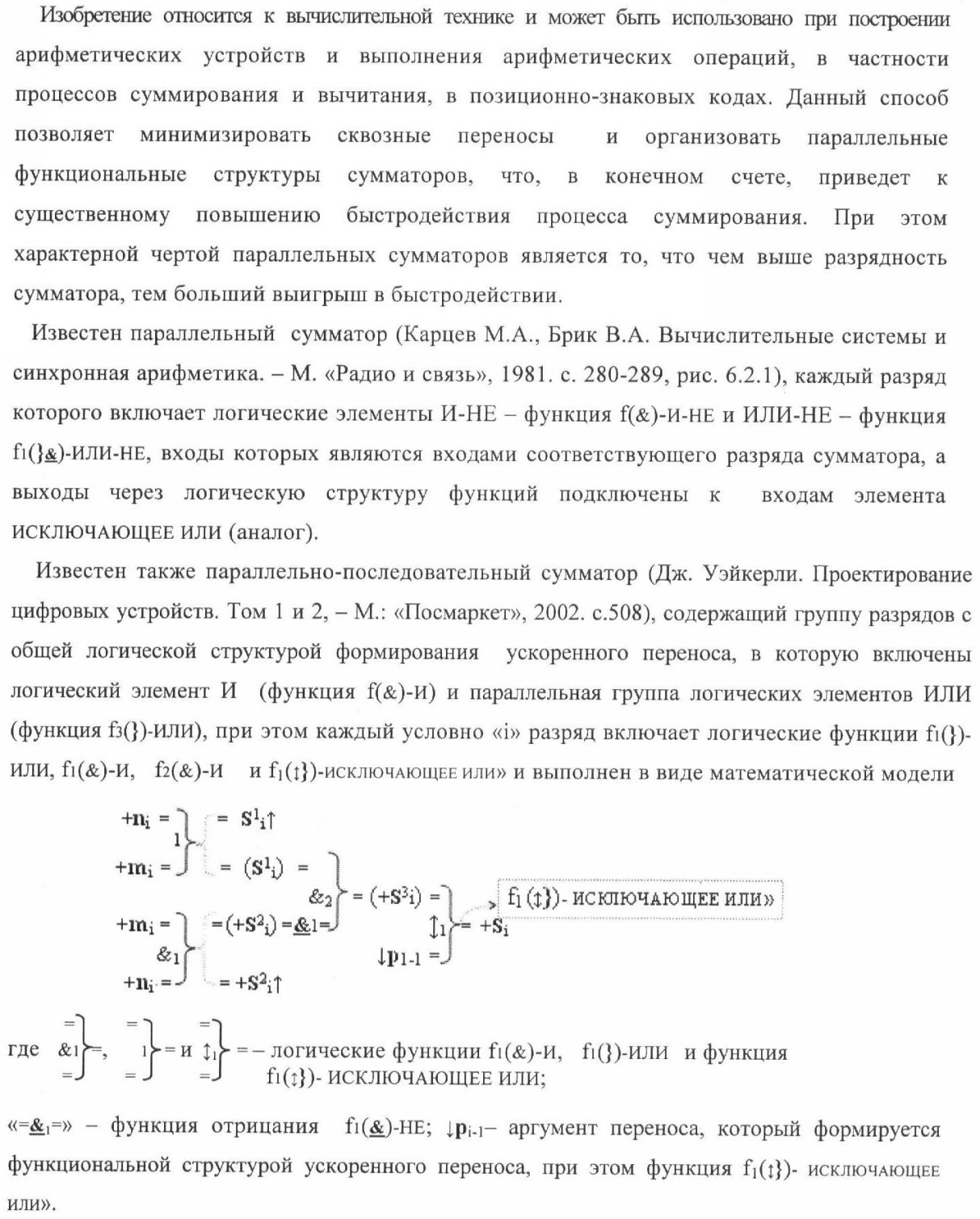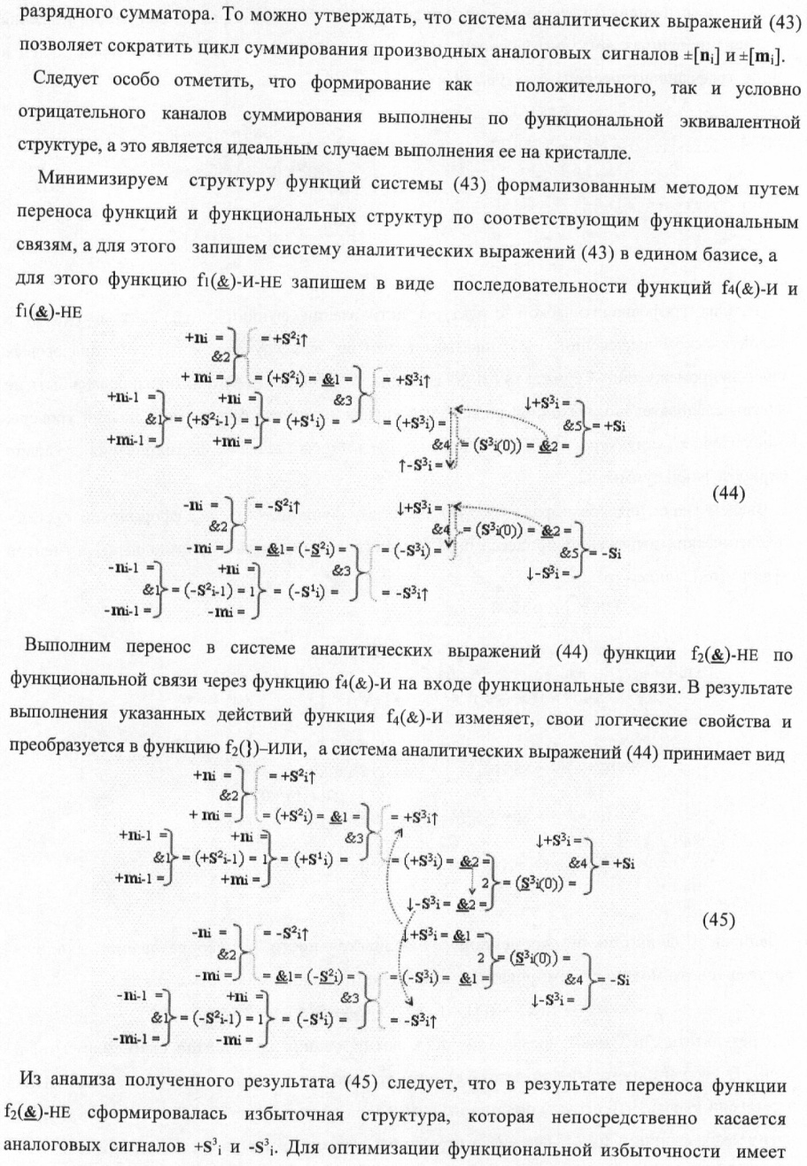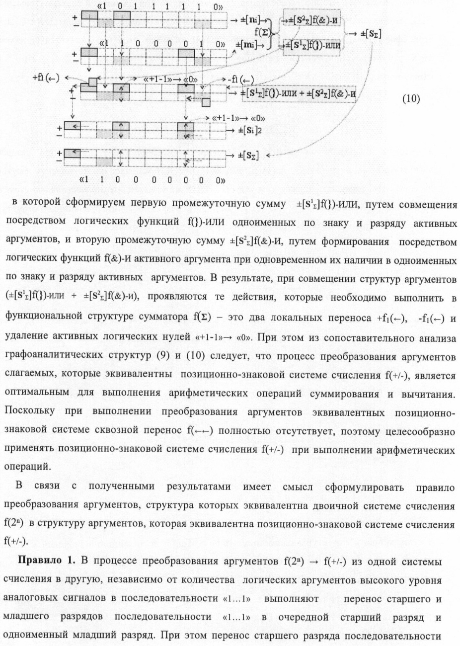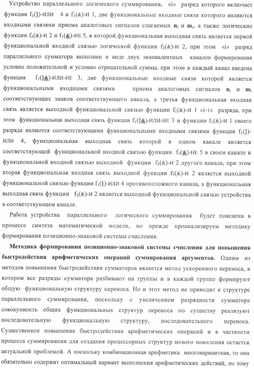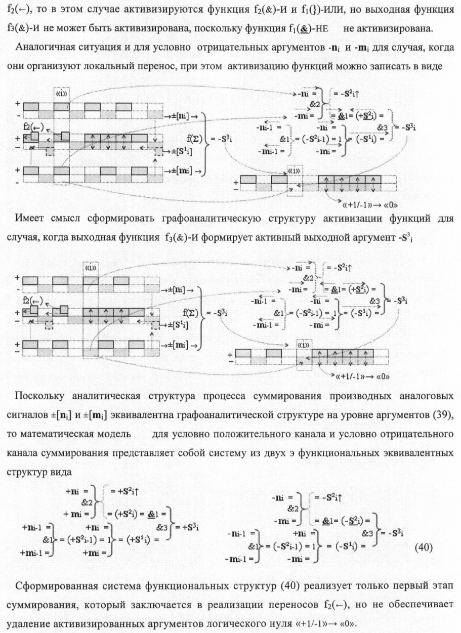1. Способ параллельного логического суммирования аналоговых сигналов слагаемых, эквивалентных позиционно-знаковой системе счисления f(+/-), включающий выполнение в условно «i» разряде преобразований аналоговых сигналов слагаемых ni и mi, с условно высоким или активным уровнем сигнала либо условно низким уровнем сигнала или неактивным, при этом из входных аналоговых сигналов ni и mi логически формируют аналоговый сигнал первой промежуточной суммы S1 i и аналоговый сигнал второй промежуточной суммы S2 i посредством функций f1(})-ИЛИ и f1(&)-И, при этом формируют положительный выходной аналоговый сигнал суммы +Si, отличающийся тем, что в условно «i» разряде одновременно формируют как положительный +Si, так и условно отрицательный выходной аналоговый сигнал -Si посредством эквивалентных логических преобразований входных позиционно-знаковых аналоговых сигналов ±ni и ±mi, при этом в «i» разряде первой промежуточной суммы S1 i аналоговый сигнал логически формируют с измененным уровнем аналогового сигнала S1 i, посредством функций f1(}&)-ИЛИ-НЕ из входных позиционно-знаковых аналоговых сигналов ±ni и ±mi и аналогового сигнала второй промежуточной суммы S2 i-1 «i-1» разряда, который затем логически объединяют посредством функции f1(})-ИЛИ с аналоговым сигналом второй промежуточной суммы S2 i «i» разряда, а логически сформированный выходной аналоговый сигнал +S3 i с измененным по уровню посредством функции f1(&)-HE и аналогичный сигнал –S3 i, но другого знака, логически преобразуют посредством функции f2(&)-И в выходной аналоговый сигнал +Si или -Si, при этом логико-динамический процесс реализуют в соответствии с математической моделью