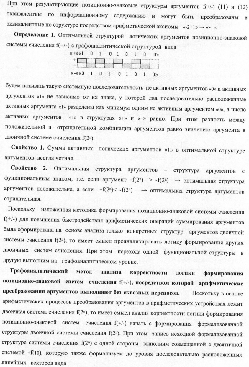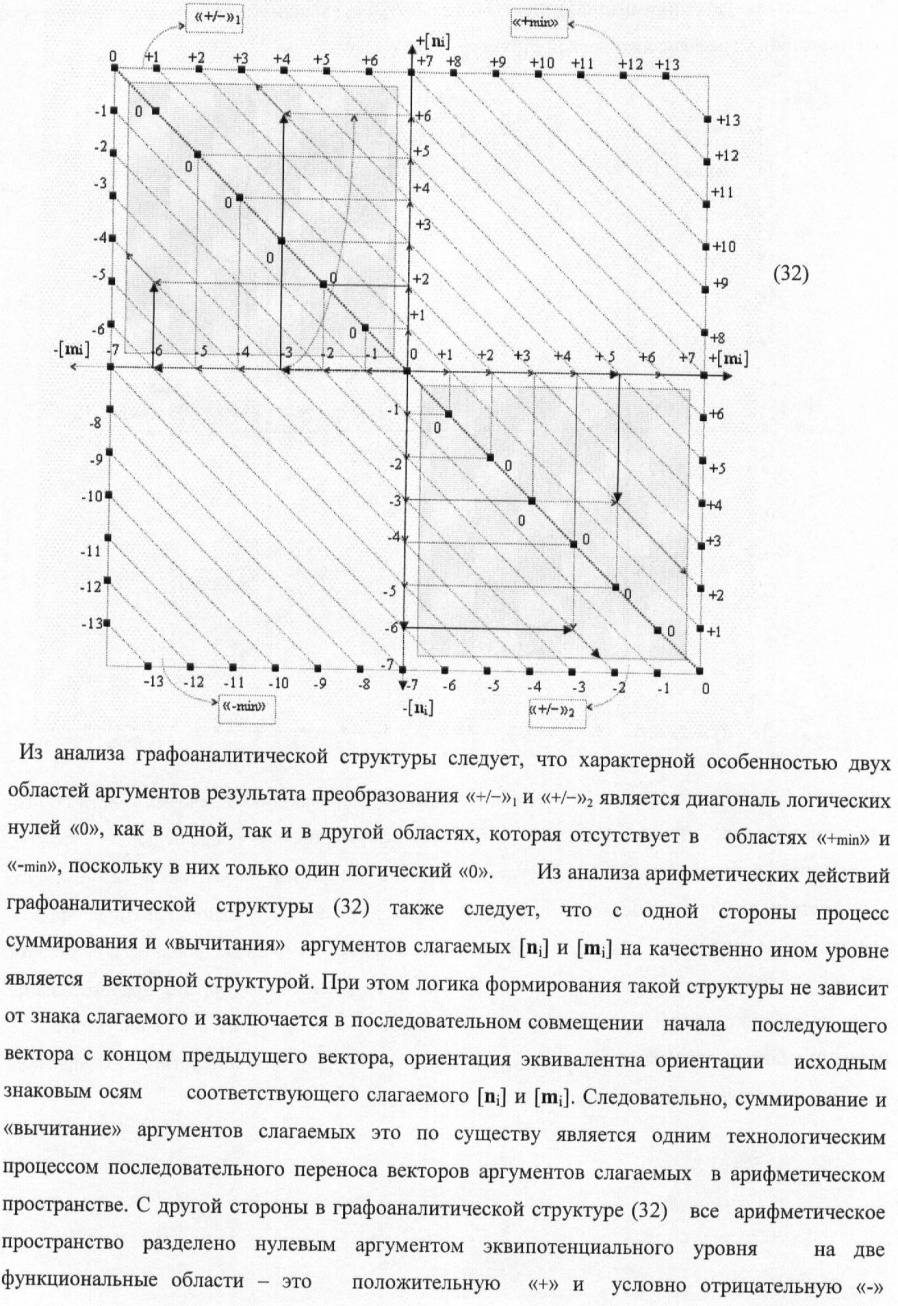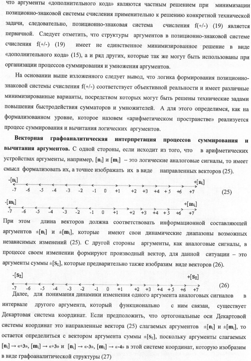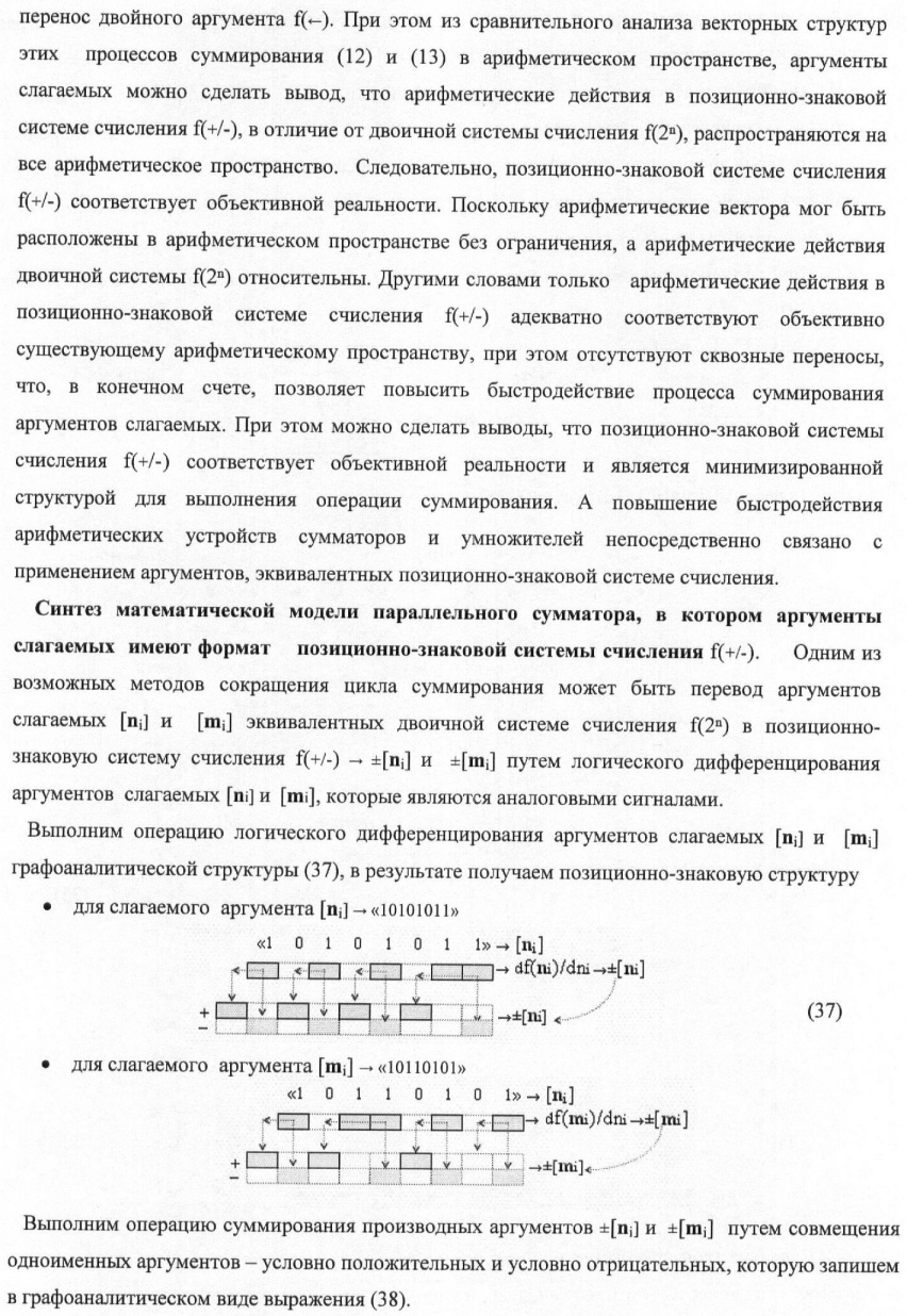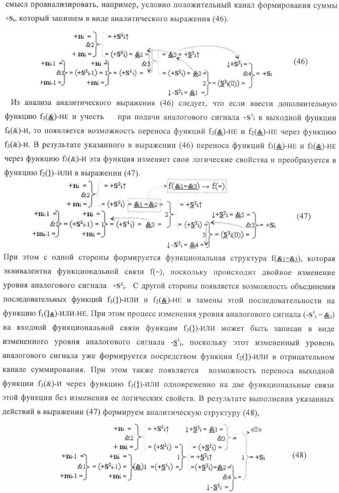 1. Способ параллельного логического суммирования аналоговых сигналов слагаемых, эквивалентных позиционно-знаковой системе счисления f(+/-), включающий выполнение в условно «i» разряде преобразований аналоговых сигналов слагаемых ni и mi, с условно высоким или активным уровнем сигнала либо условно низким уровнем сигнала или неактивным, при этом из входных аналоговых сигналов ni и mi логически формируют аналоговый сигнал первой промежуточной суммы S1 i и аналоговый сигнал второй промежуточной суммы S2 i посредством функций f1(})-ИЛИ и f1(&)-И, при этом формируют положительный выходной аналоговый сигнал суммы +Si, отличающийся тем, что в условно «i» разряде одновременно формируют как положительный +Si, так и условно отрицательный выходной аналоговый сигнал -Si посредством эквивалентных логических преобразований входных позиционно-знаковых аналоговых сигналов ±ni и ±mi, при этом в «i» разряде первой промежуточной суммы S1 i аналоговый сигнал логически формируют с измененным уровнем аналогового сигнала S1 i, посредством функций f1(}&)-ИЛИ-НЕ из входных позиционно-знаковых аналоговых сигналов ±ni и ±mi и аналогового сигнала второй промежуточной суммы S2 i-1 «i-1» разряда, который затем логически объединяют посредством функции f1(})-ИЛИ с аналоговым сигналом второй промежуточной суммы S2 i «i» разряда, а логически сформированный выходной аналоговый сигнал +S3 i с измененным по уровню посредством функции f1(&)-HE и аналогичный сигнал –S3 i, но другого знака, логически преобразуют посредством функции f2(&)-И в выходной аналоговый сигнал +Si или -Si, при этом логико-динамический процесс реализуют в соответствии с математической моделью