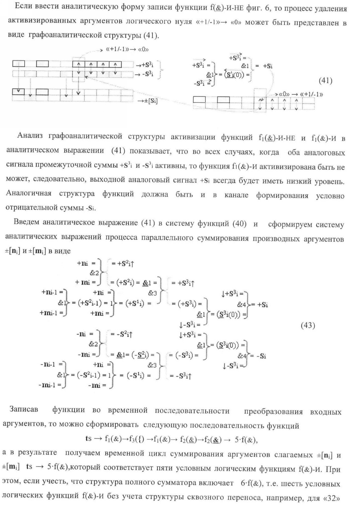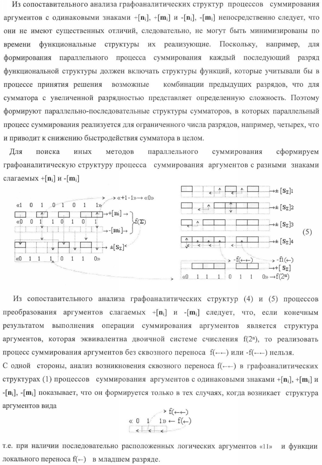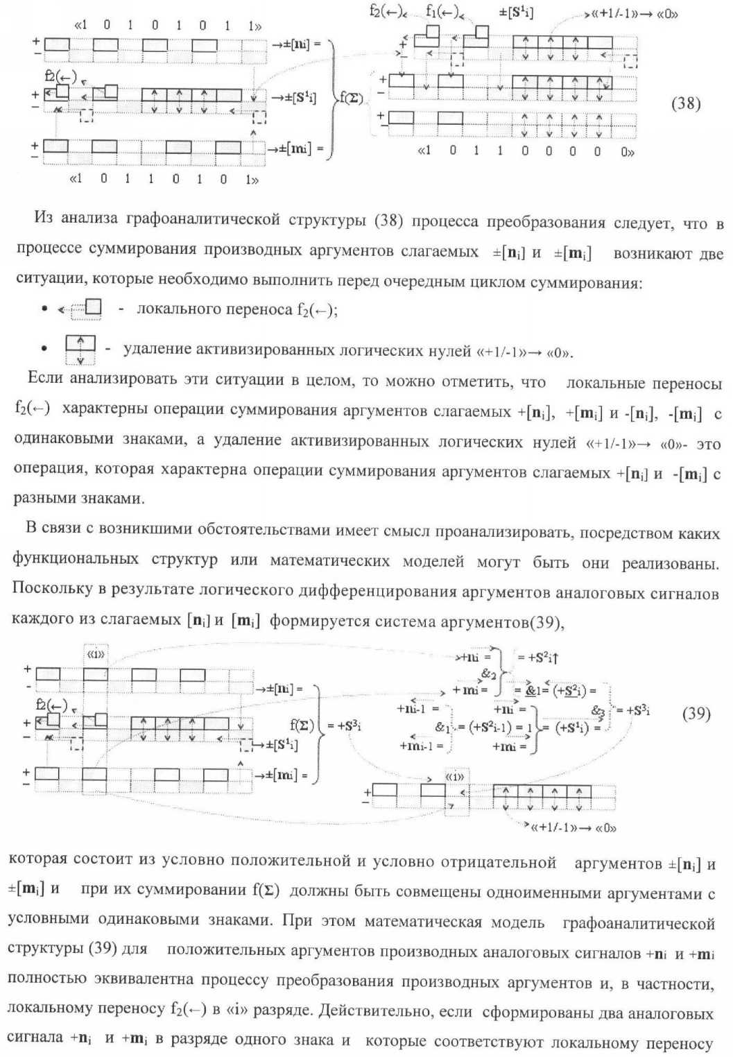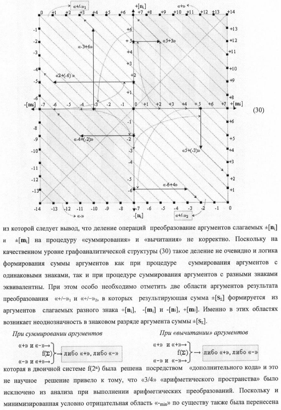 1. Способ параллельного логического суммирования аналоговых сигналов слагаемых, эквивалентных позиционно-знаковой системе счисления f(+/-), включающий выполнение в условно «i» разряде преобразований аналоговых сигналов слагаемых ni и mi, с условно высоким или активным уровнем сигнала либо условно низким уровнем сигнала или неактивным, при этом из входных аналоговых сигналов ni и mi логически формируют аналоговый сигнал первой промежуточной суммы S1 i и аналоговый сигнал второй промежуточной суммы S2 i посредством функций f1(})-ИЛИ и f1(&)-И, при этом формируют положительный выходной аналоговый сигнал суммы +Si, отличающийся тем, что в условно «i» разряде одновременно формируют как положительный +Si, так и условно отрицательный выходной аналоговый сигнал -Si посредством эквивалентных логических преобразований входных позиционно-знаковых аналоговых сигналов ±ni и ±mi, при этом в «i» разряде первой промежуточной суммы S1 i аналоговый сигнал логически формируют с измененным уровнем аналогового сигнала S1 i, посредством функций f1(}&)-ИЛИ-НЕ из входных позиционно-знаковых аналоговых сигналов ±ni и ±mi и аналогового сигнала второй промежуточной суммы S2 i-1 «i-1» разряда, который затем логически объединяют посредством функции f1(})-ИЛИ с аналоговым сигналом второй промежуточной суммы S2 i «i» разряда, а логически сформированный выходной аналоговый сигнал +S3 i с измененным по уровню посредством функции f1(&)-HE и аналогичный сигнал –S3 i, но другого знака, логически преобразуют посредством функции f2(&)-И в выходной аналоговый сигнал +Si или -Si, при этом логико-динамический процесс реализуют в соответствии с математической моделью