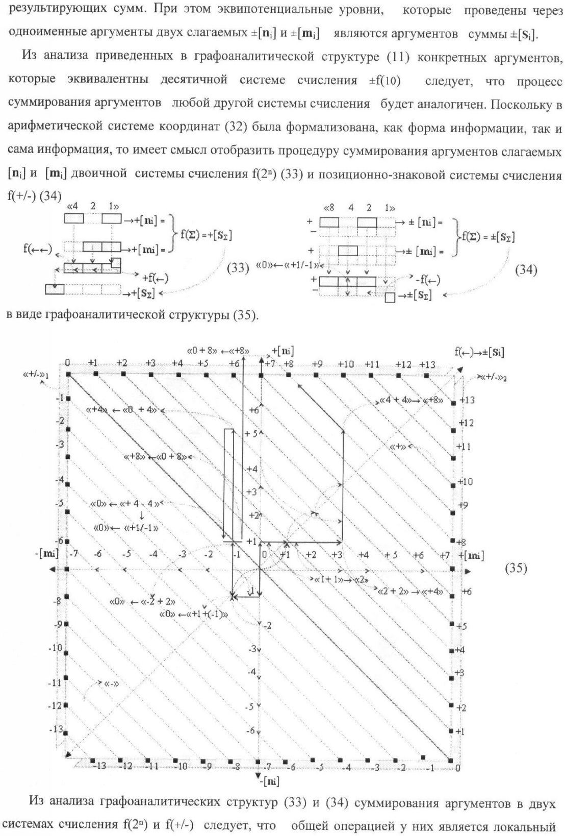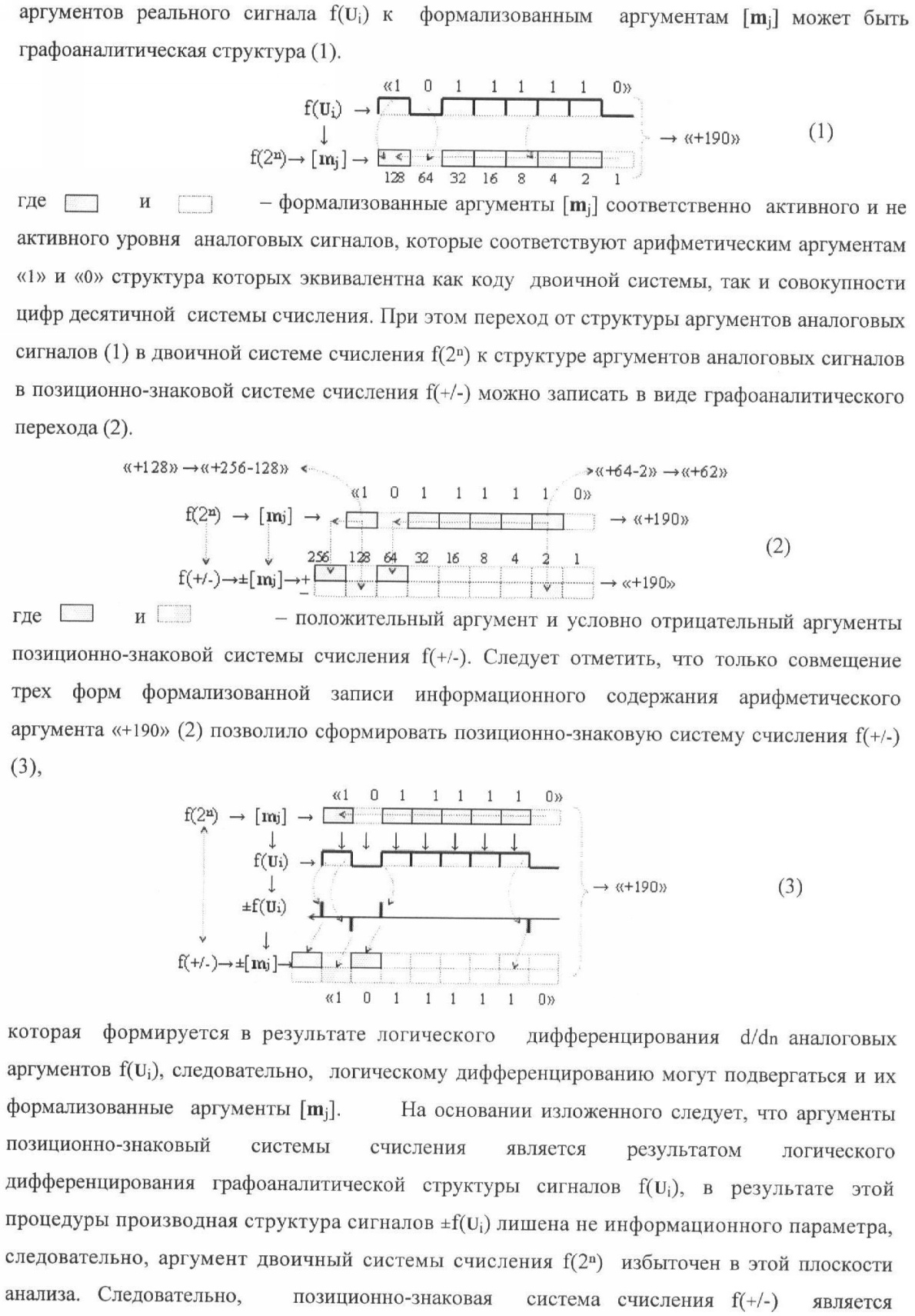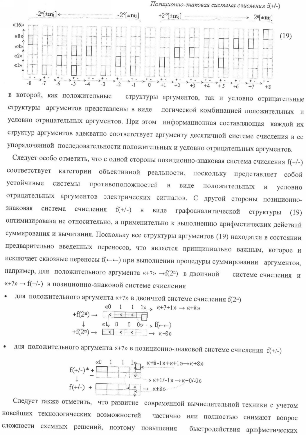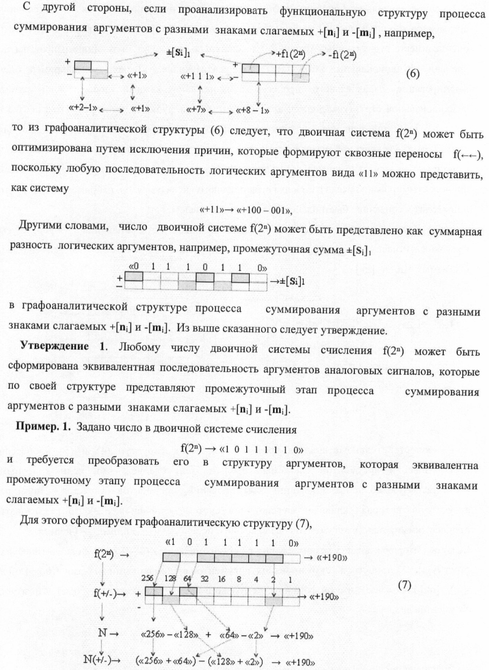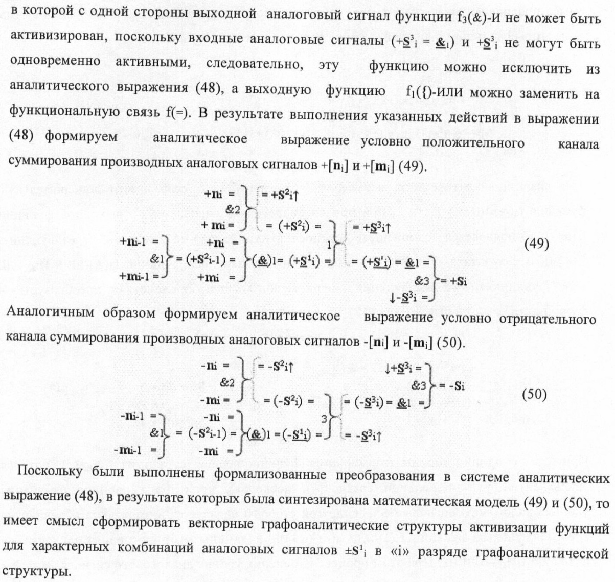 1. Способ параллельного логического суммирования аналоговых сигналов слагаемых, эквивалентных позиционно-знаковой системе счисления f(+/-), включающий выполнение в условно «i» разряде преобразований аналоговых сигналов слагаемых ni и mi, с условно высоким или активным уровнем сигнала либо условно низким уровнем сигнала или неактивным, при этом из входных аналоговых сигналов ni и mi логически формируют аналоговый сигнал первой промежуточной суммы S1 i и аналоговый сигнал второй промежуточной суммы S2 i посредством функций f1(})-ИЛИ и f1(&)-И, при этом формируют положительный выходной аналоговый сигнал суммы +Si, отличающийся тем, что в условно «i» разряде одновременно формируют как положительный +Si, так и условно отрицательный выходной аналоговый сигнал -Si посредством эквивалентных логических преобразований входных позиционно-знаковых аналоговых сигналов ±ni и ±mi, при этом в «i» разряде первой промежуточной суммы S1 i аналоговый сигнал логически формируют с измененным уровнем аналогового сигнала S1 i, посредством функций f1(}&)-ИЛИ-НЕ из входных позиционно-знаковых аналоговых сигналов ±ni и ±mi и аналогового сигнала второй промежуточной суммы S2 i-1 «i-1» разряда, который затем логически объединяют посредством функции f1(})-ИЛИ с аналоговым сигналом второй промежуточной суммы S2 i «i» разряда, а логически сформированный выходной аналоговый сигнал +S3 i с измененным по уровню посредством функции f1(&)-HE и аналогичный сигнал –S3 i, но другого знака, логически преобразуют посредством функции f2(&)-И в выходной аналоговый сигнал +Si или -Si, при этом логико-динамический процесс реализуют в соответствии с математической моделью