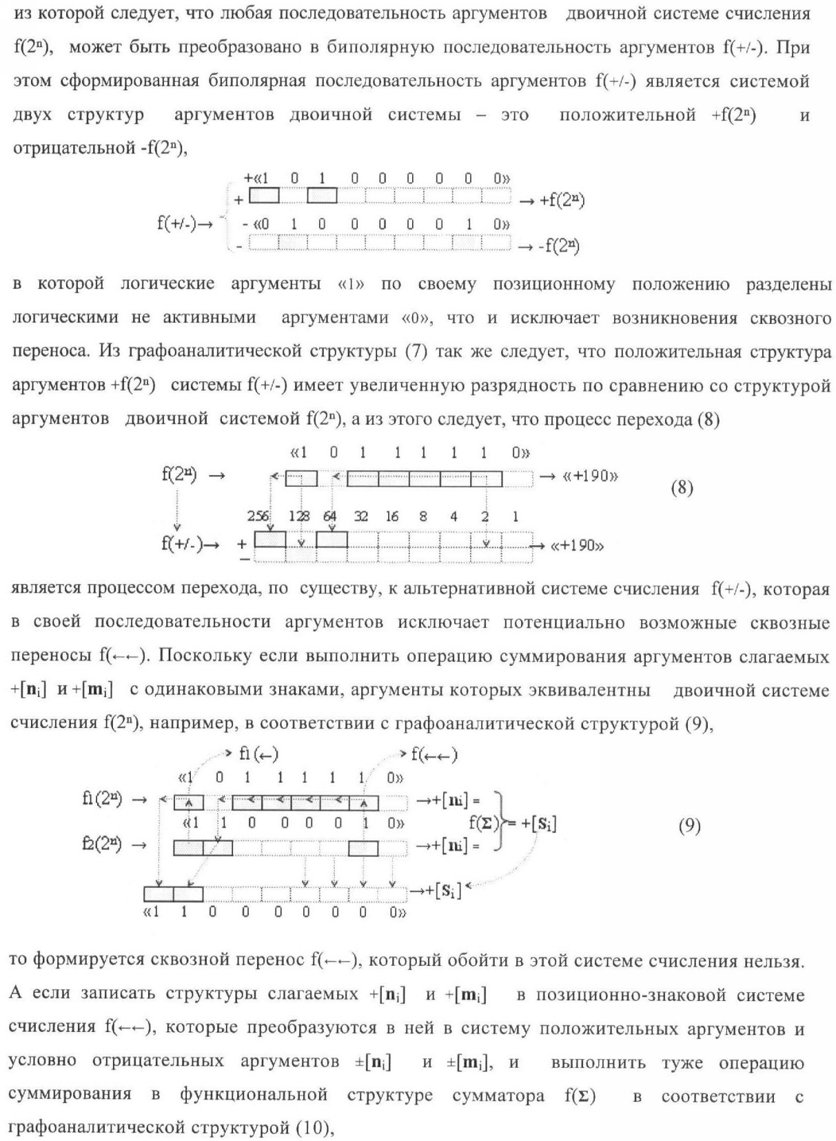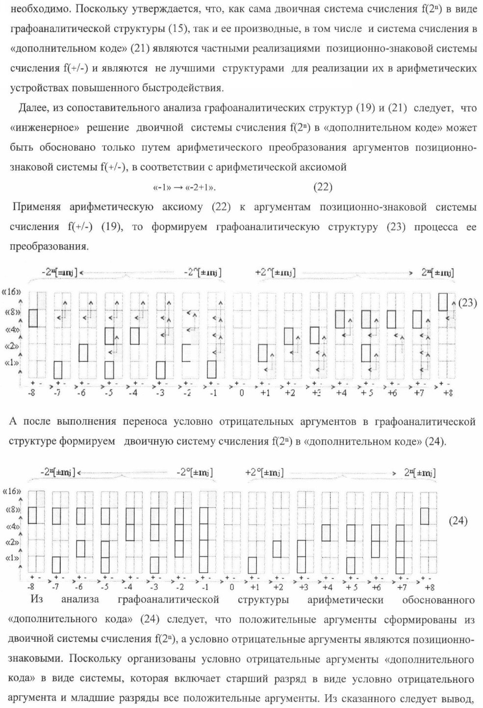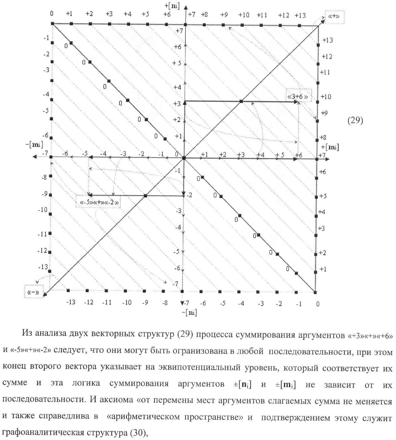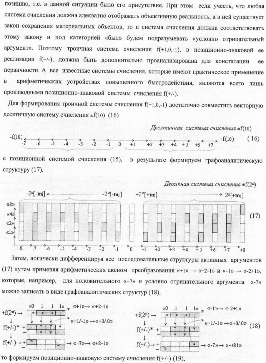 1. Способ параллельного логического суммирования аналоговых сигналов слагаемых, эквивалентных позиционно-знаковой системе счисления f(+/-), включающий выполнение в условно «i» разряде преобразований аналоговых сигналов слагаемых ni и mi, с условно высоким или активным уровнем сигнала либо условно низким уровнем сигнала или неактивным, при этом из входных аналоговых сигналов ni и mi логически формируют аналоговый сигнал первой промежуточной суммы S1 i и аналоговый сигнал второй промежуточной суммы S2 i посредством функций f1(})-ИЛИ и f1(&)-И, при этом формируют положительный выходной аналоговый сигнал суммы +Si, отличающийся тем, что в условно «i» разряде одновременно формируют как положительный +Si, так и условно отрицательный выходной аналоговый сигнал -Si посредством эквивалентных логических преобразований входных позиционно-знаковых аналоговых сигналов ±ni и ±mi, при этом в «i» разряде первой промежуточной суммы S1 i аналоговый сигнал логически формируют с измененным уровнем аналогового сигнала S1 i, посредством функций f1(}&)-ИЛИ-НЕ из входных позиционно-знаковых аналоговых сигналов ±ni и ±mi и аналогового сигнала второй промежуточной суммы S2 i-1 «i-1» разряда, который затем логически объединяют посредством функции f1(})-ИЛИ с аналоговым сигналом второй промежуточной суммы S2 i «i» разряда, а логически сформированный выходной аналоговый сигнал +S3 i с измененным по уровню посредством функции f1(&)-HE и аналогичный сигнал –S3 i, но другого знака, логически преобразуют посредством функции f2(&)-И в выходной аналоговый сигнал +Si или -Si, при этом логико-динамический процесс реализуют в соответствии с математической моделью