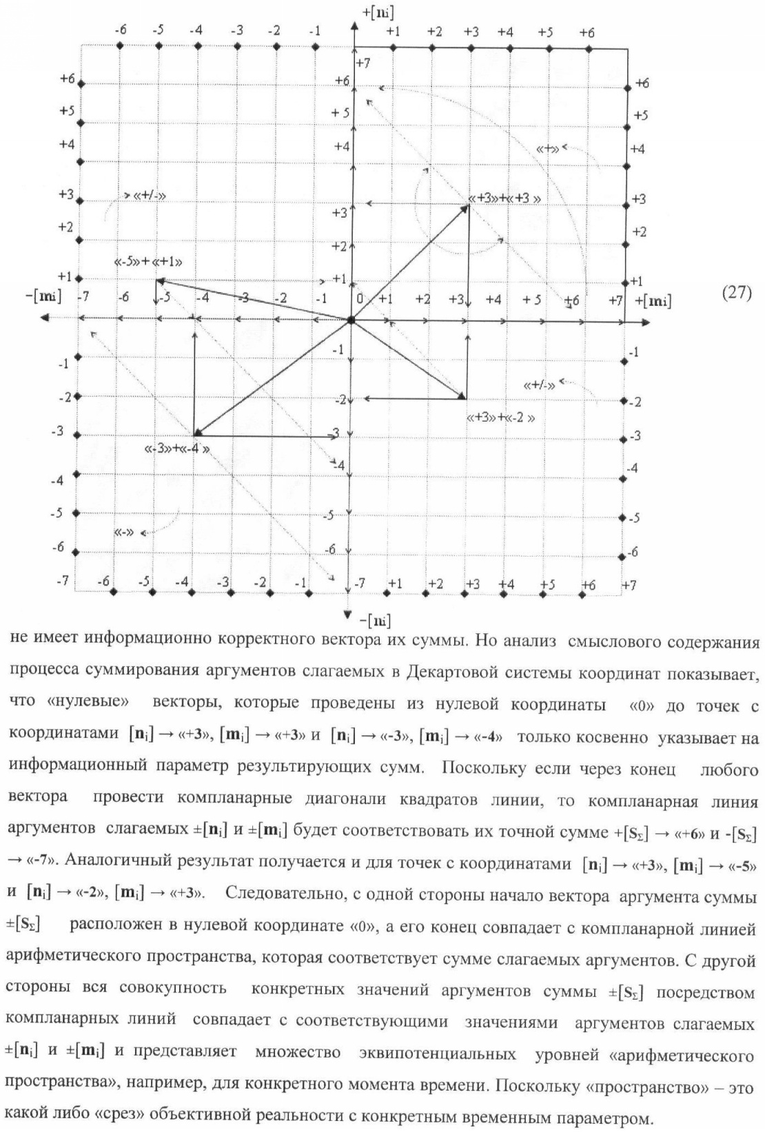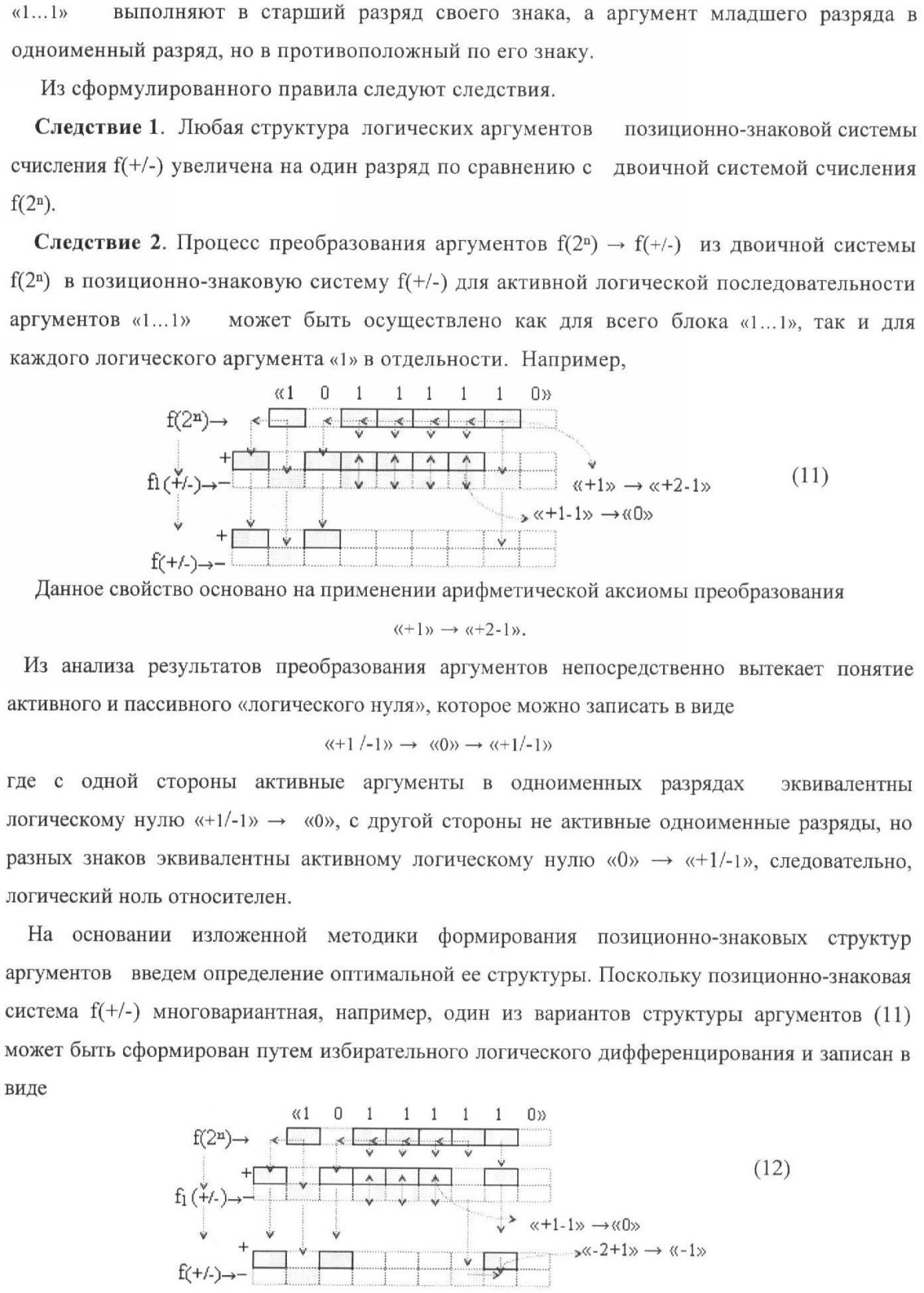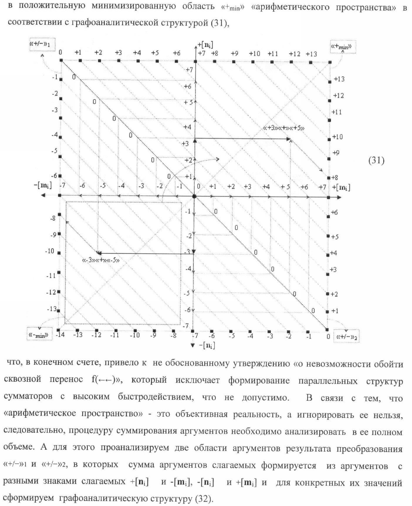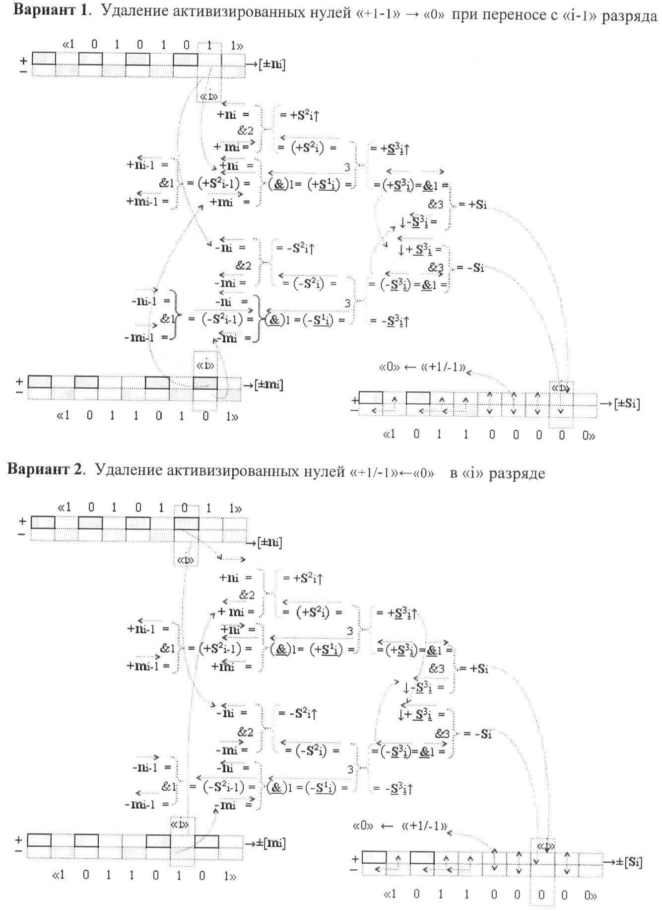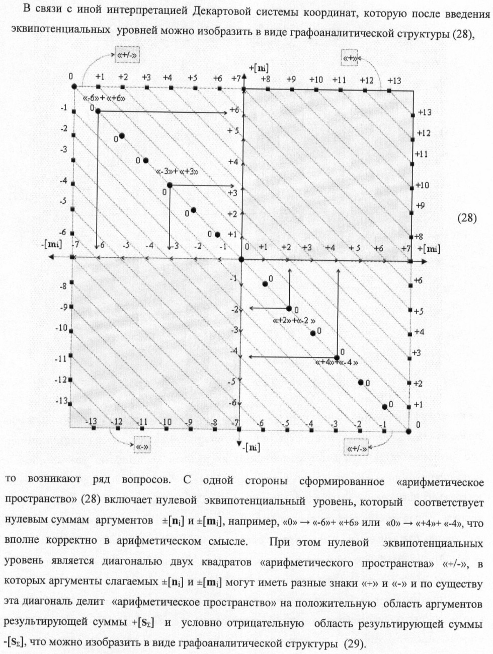 1. Способ параллельного логического суммирования аналоговых сигналов слагаемых, эквивалентных позиционно-знаковой системе счисления f(+/-), включающий выполнение в условно «i» разряде преобразований аналоговых сигналов слагаемых ni и mi, с условно высоким или активным уровнем сигнала либо условно низким уровнем сигнала или неактивным, при этом из входных аналоговых сигналов ni и mi логически формируют аналоговый сигнал первой промежуточной суммы S1 i и аналоговый сигнал второй промежуточной суммы S2 i посредством функций f1(})-ИЛИ и f1(&)-И, при этом формируют положительный выходной аналоговый сигнал суммы +Si, отличающийся тем, что в условно «i» разряде одновременно формируют как положительный +Si, так и условно отрицательный выходной аналоговый сигнал -Si посредством эквивалентных логических преобразований входных позиционно-знаковых аналоговых сигналов ±ni и ±mi, при этом в «i» разряде первой промежуточной суммы S1 i аналоговый сигнал логически формируют с измененным уровнем аналогового сигнала S1 i, посредством функций f1(}&)-ИЛИ-НЕ из входных позиционно-знаковых аналоговых сигналов ±ni и ±mi и аналогового сигнала второй промежуточной суммы S2 i-1 «i-1» разряда, который затем логически объединяют посредством функции f1(})-ИЛИ с аналоговым сигналом второй промежуточной суммы S2 i «i» разряда, а логически сформированный выходной аналоговый сигнал +S3 i с измененным по уровню посредством функции f1(&)-HE и аналогичный сигнал –S3 i, но другого знака, логически преобразуют посредством функции f2(&)-И в выходной аналоговый сигнал +Si или -Si, при этом логико-динамический процесс реализуют в соответствии с математической моделью
