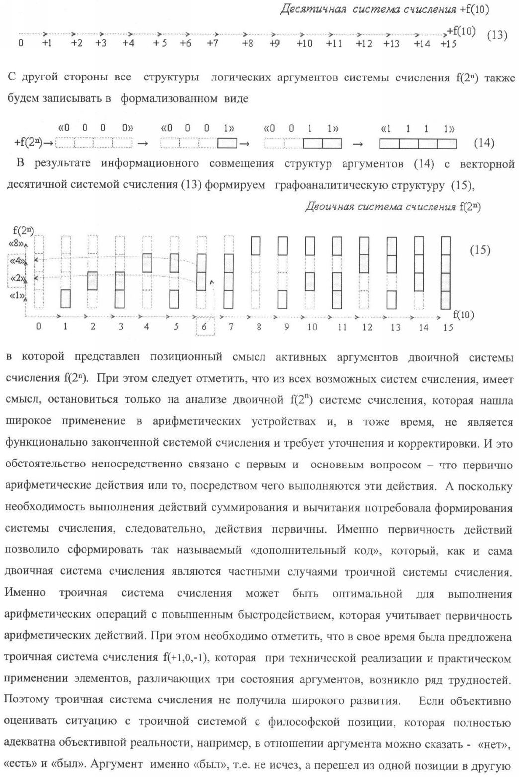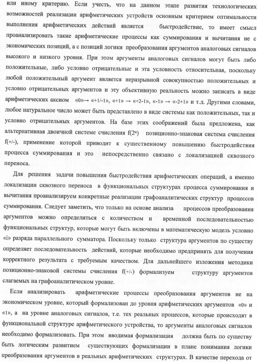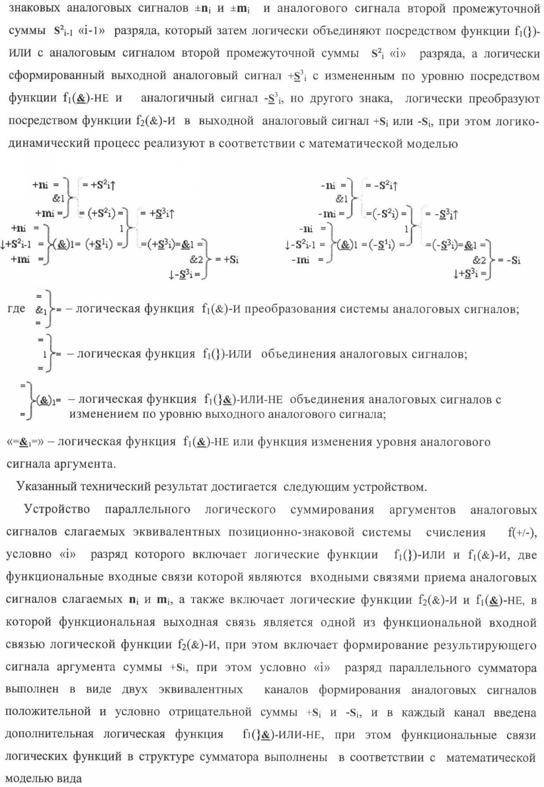 Изобретение относится к вычислительной технике и может быть использовано при построении арифметических устройств и выполнении арифметических операций, в частности процессов суммирования и вычитания. Техническим результатом является повышение быстродействия суммирования. Каждый разряд устройства параллельного логического суммирования аргументов аналоговых сигналов слагаемых эквивалентных позиционно-знаковой системе счисления f(+/-), выполнен в виде двух эквивалентных каналов формирования аналоговых сигналов положительной и условно отрицательной суммы +Si и -Si, каждый из которых включает два элемента И, элемент ИЛИ, элемент ИЛИ-НЕ, элемент НЕ.2 н.п. ф-лы, 6 ил.