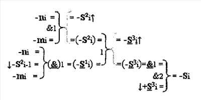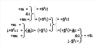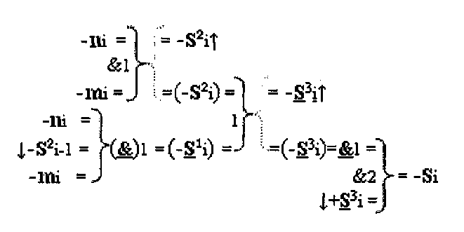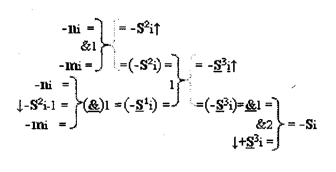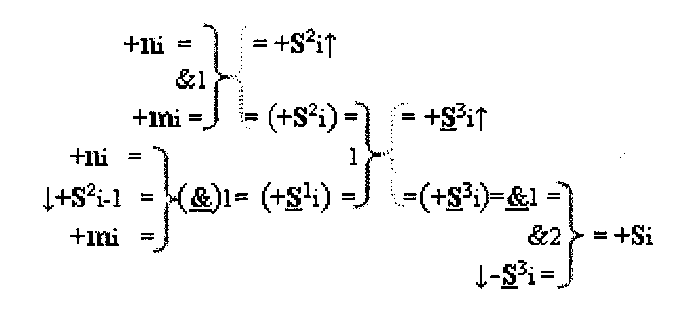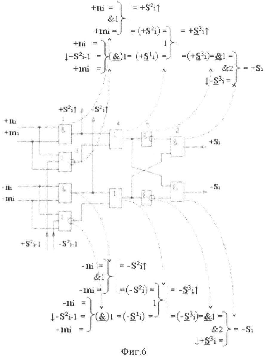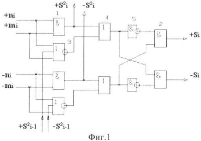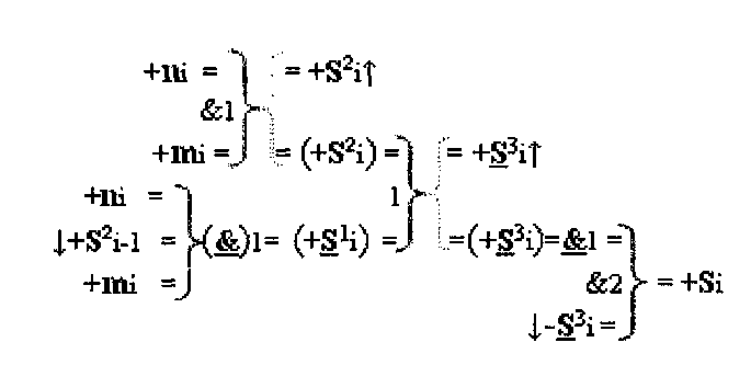 2. Устройство параллельного логического суммирования аргументов аналоговых сигналов слагаемых, эквивалентных позиционно-знаковой системе счисления f(+/-), условно «i», разряд которого включает логические функции f1(})-ИЛИ и f1(&)-И, две функциональные входные связи которой являются входными связями приема аналоговых сигналов слагаемых ni и mi, а также включает логические функции f2(&)-И и f1(&)-HE, в которой функциональная выходная связь является одной из функциональной входной связью логической функции f2(&)-И, при этом включает формирование результирующего сигнала аргументы суммы +Si, отличающееся тем, что условно «i» разряд параллельного сумматора выполнен в виде двух эквивалентных каналов формирования аналоговых сигналов положительной и условно отрицательной суммы +Si и -Si, и в каждый канал введена дополнительная логическая функция f1(}&)-ИЛИ-НЕ, при этом функциональные связи логических функций в структуре сумматора выполнены в соответствии с математической моделью вида
