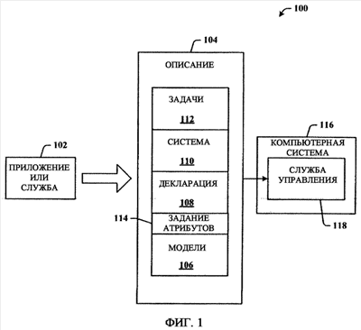 На Фиг.1 проиллюстрирована архитектура 100, которая обеспечивает основанное на модели управление приложениями или службами в соответствии с настоящим изобретением. Основанный на модели подход к управлению позволяет разработчику описать приложение или службу 102 в терминах его составляющих компонентов и желаемые состояния в терминах функциональных возможностей, конфигурации, защиты и рабочих характеристик. Таким образом, описание 104 приложения или службы обеспечивает описание приложения или службы 102 в терминах одного или более управляемых компонентов, включающих в себя по меньшей мере компонент 106 моделей, компонент 108 декларации, системный компонент 110 и компонент 112 задач.