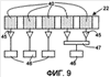 При этом считывание отдельных пикселей 40 детекторной линейки 22 может осуществляться, например, последовательно с использованием сдвигового регистра. Однако в предпочтительном варианте предусмотрено параллельное считывание отдельных пикселей 40 и/или групп пикселей детекторной линейки 22. Согласно варианту, показанному на фиг.9, три левых пикселя 40 считываются соответственно по отдельности, при этом измеренный сигнал каждого пикселя 40 усиливается взаимодействующим с ним собственным усилительным каскадом 45, каждый из которых может представлять собой, например, компонент кремниевой подложки 42 согласно фиг.7, и подается во взаимодействующий с соответствующим пикселем функционально связанный с ним аналого-цифровой преобразователь 46. Сигналы от обоих правых пикселей, схематично показанных на фиг.9, также сначала усиливаются отдельными усилительными каскадами 45, затем направляются в общий мультиплексор 47, в состав которого может также входить при определенных условиях устройство выборки и хранения, и после этого подаются в общий аналого-цифровой преобразователь 46, соединенный с мультиплексором 47.