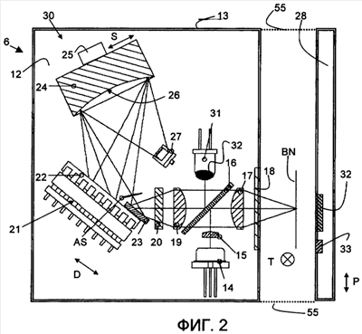 Входная щель спектрометра 30 обозначена на фиг.2 позицией AS. Входная щель AS может быть расположена в корпусе 13 в виде диафрагмы AS, размещенной на пути прохождения светового луча. Правда, возможен вариант, когда на этом месте расположена не диафрагма, а лишь “виртуальная” входная щель AS, определяемая следом освещения банкноты BN источником 14 света. Последний вариант дает более высокую интенсивность света, но также может характеризоваться нежелательной повышенной чувствительностью к внешнему освещению или к рассеянному свету.