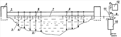 Сущность изобретения поясняется чертежом, на котором представлена структурная схема, где: 1 – трос, 2 – вертикальные опоры, 3 – отрезки пьезоэлектрического кабеля, 4 – водная среда, 5 – грузы, 6 – согласующее устройство, 7 – коаксиальный радиочастотный кабель, 8 – распорки, 9 – разделительный конденсатор, 10 – формирователь сигнала тревоги, 11 – нагрузочный резистор, 12 – источник питающего напряжения.