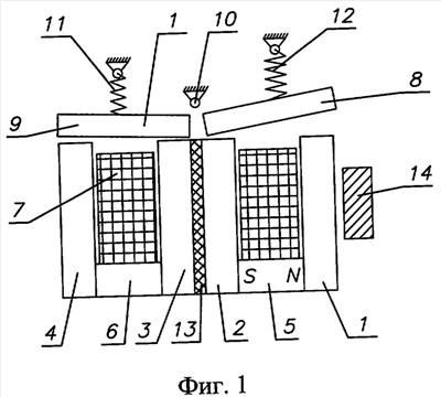 Это достигается тем, что магнитопровод выполнен из двух пар одинаковых стержней. Между каждой парой стержней выполнены магнитопроводящие вставки, причем в первой паре стержней в качестве такой вставки установлен постоянный магнит, а во второй паре – магнитопроводящее ярмо. Кроме того, эти пары стержней разделены между собой элементом, выполненным из изоляционного материала.