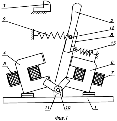 Выключатель автоматический быстродействующий содержит основание 1, подвижный 2 и неподвижный 3 контакты, включающий электромагнит с магнитопроводом 4 и катушкой 5, удерживающий электромагнит с магнитопроводом 6 и катушкой 7 и якорь 8, который размещен между магнитопроводами 4 и 6, отключающую пружину 9. Удерживающий и включающий электромагниты вращаются на оси 10 в кронштейне 11, неподвижно закрепленном на основании 1. Якорь 8 соединен с подвижным контактом 2 через ось 12. На свободном конце подвижного контакта 2 закреплена пружина 13, которая упирается в удерживающий магнитопровод 6. Отключающая пружина 9 закреплена на подвижном контакте 2.