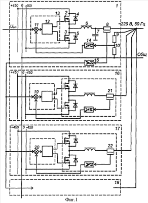 Структурная схема второго инвертора 16, называемого ведомым, третьего (17) и других ведомых инверторов (18) аналогична схеме ведущего инвертора 1. Отличие заключается в отсутствии конденсаторов фильтра и в том, что на входы сумматора (19, 20) каждого инвертора подаются сигнал выходного тока ведущего инвертора и сигнал выходного тока соответствующего инвертора с датчика тока (21 и 22).