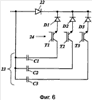 на фиг.5 показаны другие примеры вариантов выполнения изобретения, в которых резистор, подключенный параллельно диоду, позволяет формировать отрицательный ток возбуждения и/или изменять время разряда емкости, причем емкость содержит отдельные конденсаторы, соединенные последовательно, и в качестве переключателей использованы разные полупроводниковые переключатели (тиристоры, GTO, БТИЗ);